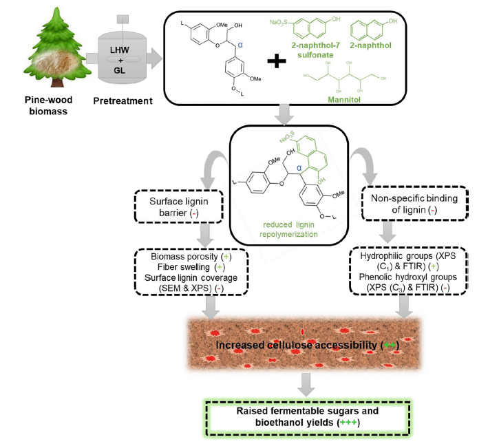 孙付保教授团队在纤维质糖精炼型生物制造方面取得明显进展,相关成果陆续发表在Green Chem (2021, 23: 9600-9609)、Bioresouce Technology (2022, 344: 126264)、Bioresource Technology (2021, 338: 125505)、Industrial Crops & Products (2021, 171: 113975)。近期,研究团队在强化木质纤维素底物水解糖化方面取得重要进展,研究成果“Alleviating lignin repolymerization by carbocation scavenger for effective production of fermentable sugars from combined liquid hot water and green-liquor pretreated softwood biomass”正式发表于Energy Conversion and Management (IF=9.709) ()