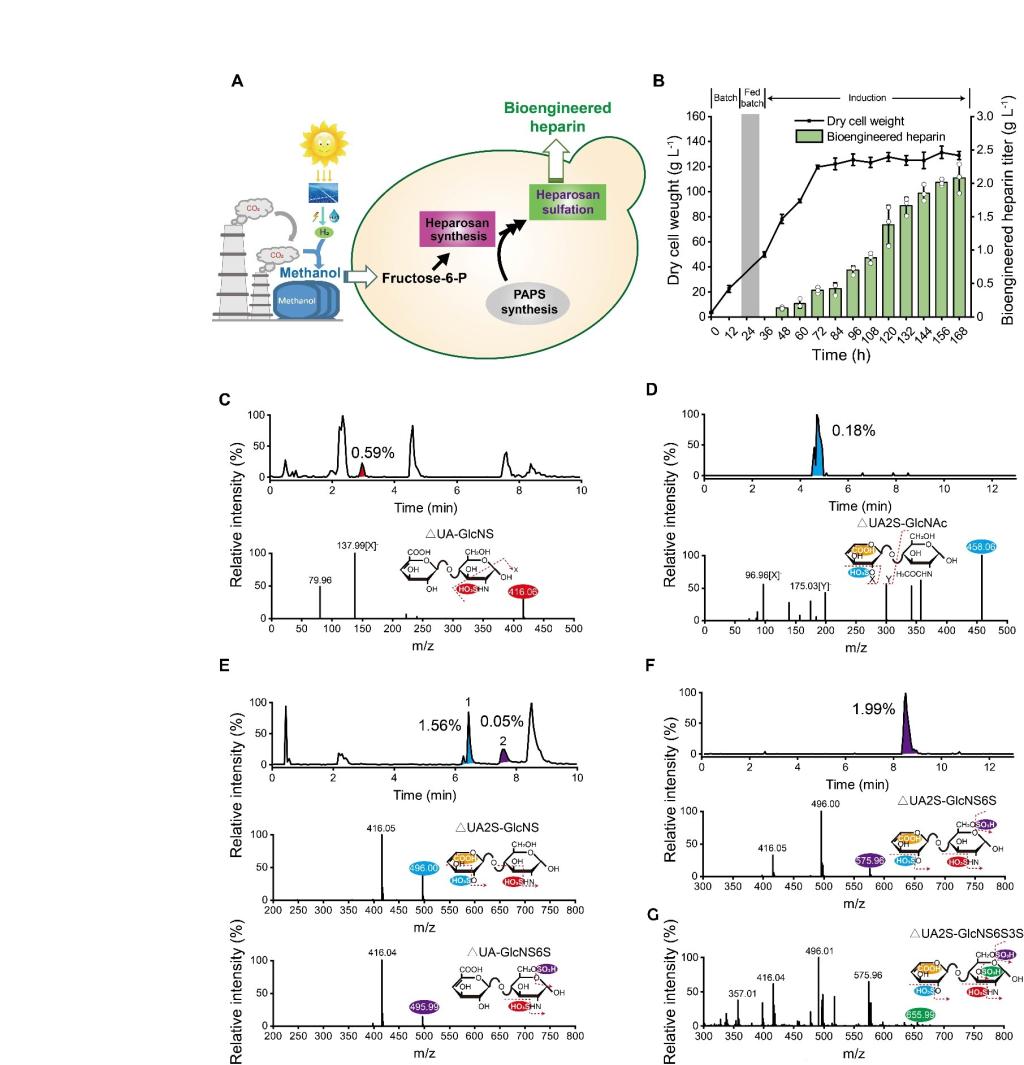 肝素是医学上最广泛的抗凝药物,用于临床血栓、心梗等疾病治疗。目前市场上肝素依赖于猪小肠等动物组织提取。肝素在脊椎动物中发挥着多种作用,如胚胎发育、抗菌/病毒感染(如COVID-19)、抗炎症反应和血液凝固等。动物源肝素中其他糖胺聚糖(如过磺酸化硫酸软骨素)的可变结构和污染加剧了医疗风险,阻碍了其结构-活性关系的研究。目前,已报道的肝素的合成方法有化学法和化学-酶法,但其面临着步骤繁琐或者高成本等障碍。针对现有问题,研究人员开发了一种绿色、简便、易培养的微生物平台合成生物工程肝素,具有与动物源肝素相似的抗凝血活性。