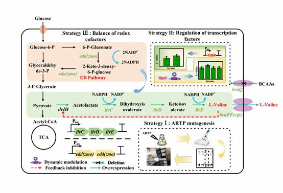 饶志明团队开发了多模块工程策略获得了一株高效生产L-缬氨酸的工程菌株。首先,通过随机诱变结合高通量筛选,获得生产L-缬氨酸的底盘菌株。采用代谢工程策略以改进L-缬氨酸的生物合成,包括替换关键基因ilvCDE的启动子以加强L-缬氨酸合成途径、敲除基因brnQ以及过表达来自谷氨酸棒杆菌中编码转运蛋白操纵子brnFE。然后对不同溶氧条件下的转录组进行分析,进一步探究了影响L-缬氨酸合成相关的转录调控因子,并应用转录调控因子工程技术进一步提高了L-缬氨酸的产量。最后,开发了辅因子工程,通过引入运动发酵单胞菌的异源途径和敲除编码ATP消耗酶的基因来提高L-缬氨酸的产量。最终菌株VAL38在5L分批补料发酵中,L-缬氨酸产量达到92 g/L,糖酸转化率和生产强度分别达到0.34g/g葡萄糖和1.92 g/L/h。