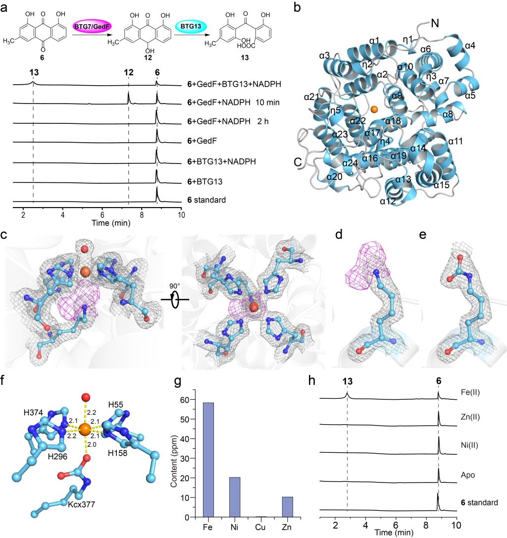贝第高林1(Beticolin 1)是一种具有抗菌和抗肿瘤活性的天然产物,它由一个蒽醌和一个卤代氧杂蒽酮通过特殊的双环[3.2.2]壬烷连接而成。利用光介导的比较转录组学,饶义剑教授团队首次鉴定了植物致病菌尾孢菌中贝第高林1的生物合成基因簇,并在阐明贝第高林1的生物合成途径的过程中,发现了一种催化蒽醌开环的新型非血红素铁加氧酶BTG13,其活性中心的铁离子与4个组氨酸,1个特殊的羧化赖氨酸(Kcx377)以及1个水分子配位。此外,晶体结构分析以及体外实验表明氨基酸His58和Thr299可以通过调节赖氨酸的羧化进而影响BTG13的酶活。以上研究成果所揭示的新型金属酶BTG13,不仅拓展和丰富了人们对金属酶的认识,也为合成生物学元件的设计和构建提供了坚实的基础。