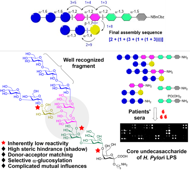 糖化学与生物技术教育部重点实验室尹健教授团队在幽门螺旋杆菌糖链抗原全合成及抗原性研究方面取得新进展。研究成果“Chemical Synthesis of the Highly Sterically Hindered Core Undecasaccharide ofHelicobacter pyloriLipopolysaccharide for Antigenicity Evaluation with Human Serum”发表于化学领域著名期刊Journal of the American Chemical Society(J. Am. Chem. Soc.)。