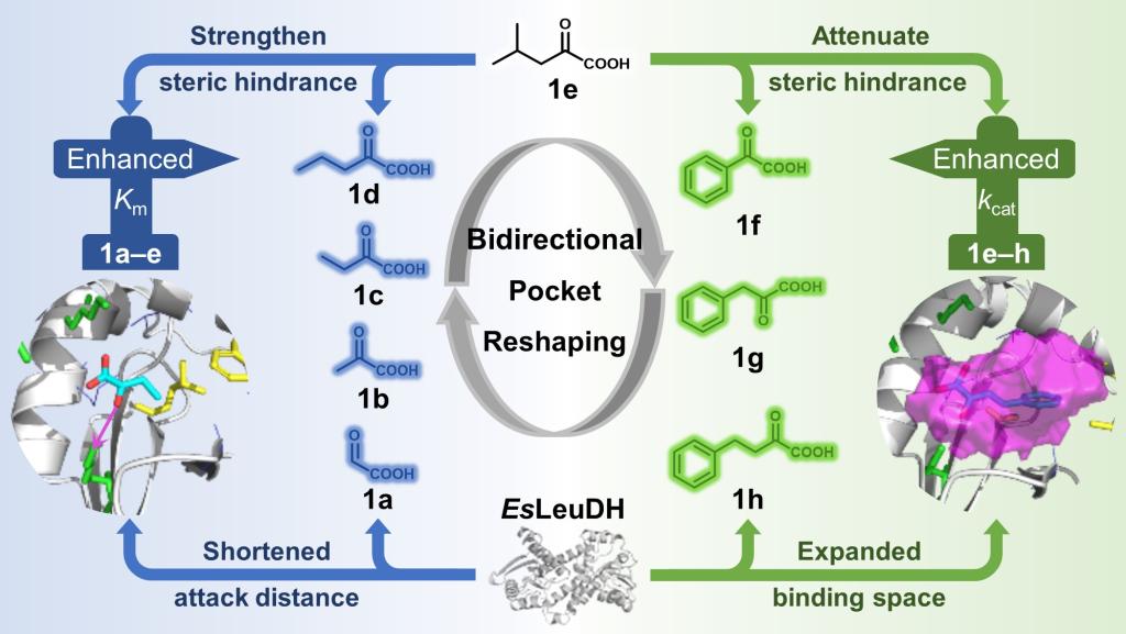 该研究以EsLeuDH为模型催化剂,通过在单个突变位点设计和实施基于空间位阻修饰的双向口袋重塑,解析了酶口袋空间位阻影响小底物接受度的调控规律并阐明了空间位阻影响小底物和大底物接受度之间分子机制的差异,在氨基酸脱氢酶家族成员和其他具有类似底物结合口袋的氧化还原酶的多样性底物接受度进化中具有潜在的应用前景。
