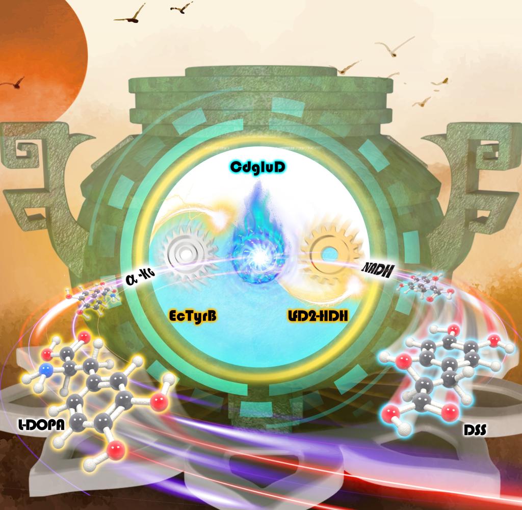 倪晔团队设计了一条体外多酶级联高效合成丹参素的新路线,并对合成丹参素的反应条件进行了优化。该路线主要包括芳香族氨基酸转氨酶(EcTyrB)、d-异构体特异性2-羟酸脱氢酶(LfD2-HDH)和谷氨酸脱氢酶(CdgluD)三个酶,以L-DOPA为底物合成DSS。该路线由三个酶促反应组成,首先是L-DOPA通过EcTyrB脱氨基生成3,4-二羟基苯丙酮酸(DPA),同时α-酮戊二酸作为氨基受体生成谷氨酸。之后通过LfD2-HDH与NADH将DPA还原为DSS,NADH被氧化生成NAD+。最重要的一个反应是CdgluD催化NAD+和谷氨酸生成NADH和α-酮戊二酸。在该路线中,CdgluD将EcTyrB和LfD2-HDH催化生成的NAD+和谷氨酸在多酶级联催化反应中循环使用实现了NADH和α-酮戊二酸的自给自足,有效地降低了生产成本,并且减少了副产物的产生。