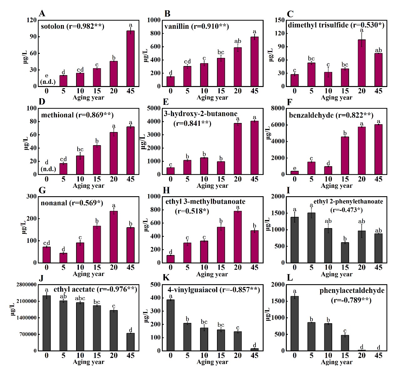 图2陈酿0年、5年、10年、15年、20年、45年的清香型白酒中香气物质浓度及其与陈年时间的相关性