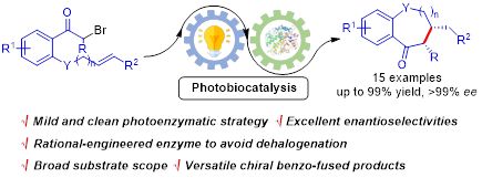 苯并含氧杂环骨架广泛存在于天然产物和药物分子中,如血管扩张剂维司那定和抗凝血剂华法林,且该骨架的不对称催化合成充满挑战。生物催化因其高效、可持续、条件温和、具有良好的化学选择性、区域选择性和立体选择性等优点被认为是不对称合成的理想策略。然而,由于天然酶具有严格的反应和底物特异性,通过生物催化法制备手性苯并含氧杂环化合物仅局限于个别孤例,该领域尚未得到充分研究。