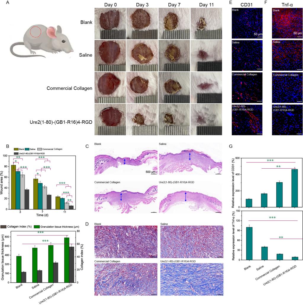 图5 超分子弹性蛋白可替代手术缝合线促进线性伤口的修复和组织再生。