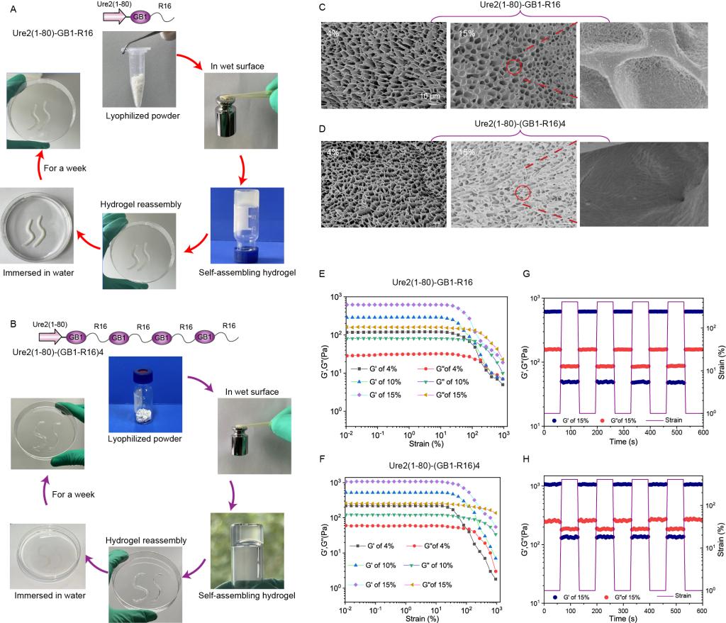 图1 超分子弹性蛋白遇水即粘,在1%浓度时即可形成可注射式超分子水凝胶,水凝胶在水下依旧具有粘附性。本论文的水凝胶形成无需任何额外预处理手段,只需要将蛋白溶解静置即可获得,可以最大程度保持蛋白活性
