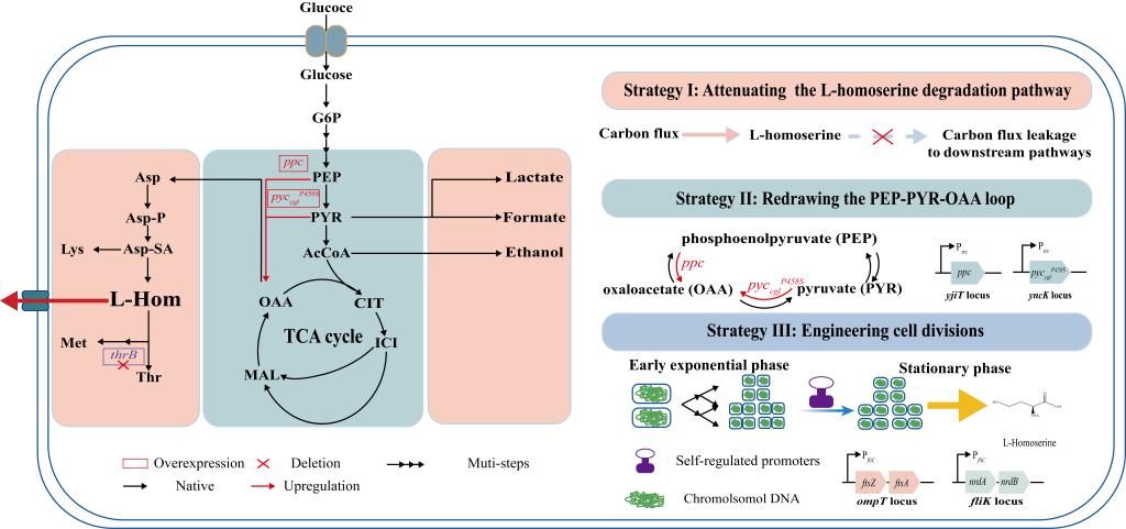 饶志明教授团队针对L-高丝氨酸工程菌株生产过程中可能出现的L-高丝氨酸合成速率随细胞持续生长而降低等问题,采用双重策略改造大肠杆菌高效制备L-高丝氨酸。首先,探究削弱有机酸分支代谢与L-高丝氨酸降解途径对L-高丝氨酸积累的作用。在阻遏L-苏氨酸的合成通路后,HOM5菌株摇瓶发酵36 h 积累50.15 g/L L-高丝氨酸,相比出发菌株提高21.63%。其次,通过重构PEP-PYR-OAA环加强OAA的积累促进 L-高丝氨酸生产。在增加ppc的拷贝数并引入来自谷氨酸棒杆菌的pycP458S cgl后,HOM14菌株的L-高丝氨酸产量升至54.25 g/L,比HOM5的L-高丝氨酸产量增加8.18%。随后考察了细胞分裂与L-高丝氨酸合成的关系,发现细胞分裂缩短的菌株显示出更高的L-高丝氨酸产量。然而,随着发酵后期生物量的持续增长,L-高丝氨酸的合成速率开始放缓并影响最终的产量。因此,引入自我调节启动子改造细胞分裂以协调细胞生长与L-高丝氨酸合成。HOM23摇瓶发酵 36 h积累62.49 g/L的L-高丝氨酸,其也是本研究中工程菌株通过摇瓶发酵达到的最高L-高丝氨酸产量。最后,将该菌株用于5 L发酵罐放大生产。最终菌株HOM23在5 L发酵罐中能够积累101.31 g/L L-高丝氨酸,生产强度达到1.91 g/L/h。其为已报道的无质粒菌株生产L-高丝氨酸所达到的最高产量及生产强度。本研究为生物合成L-高丝氨酸提供了一种绿色、高效的方法并为有价值化学品的大规模合成提供了可能的解决方案。