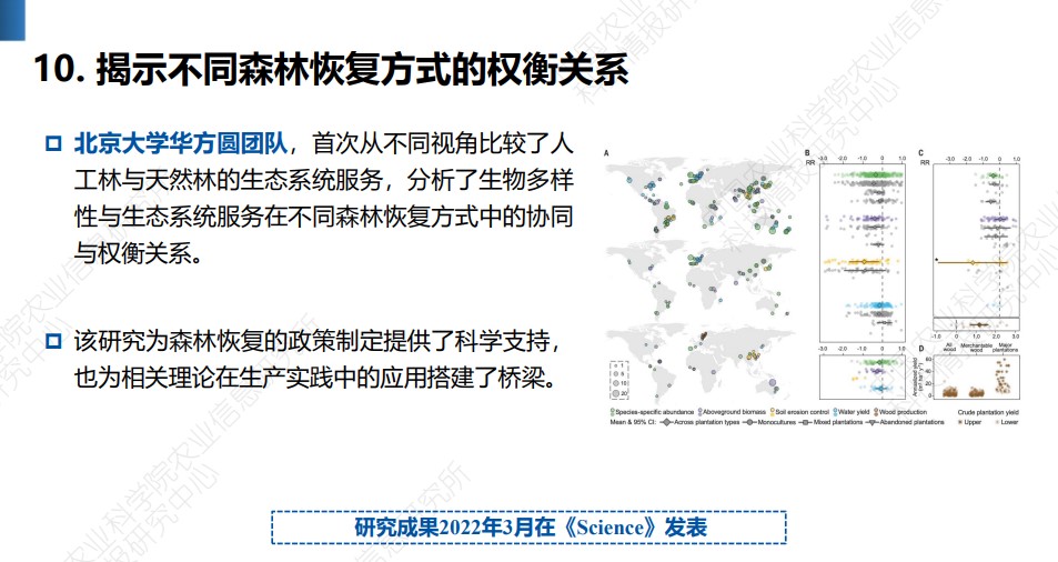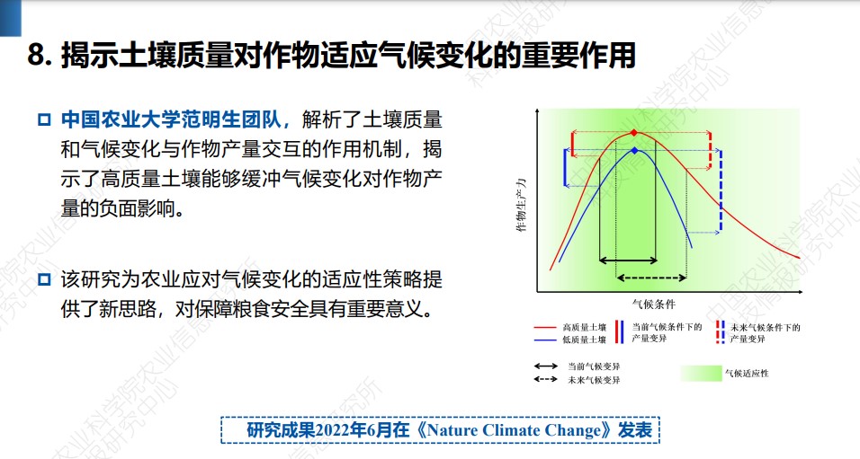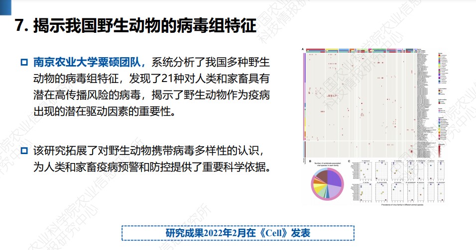 2023年12月6日召开的中国农业农村科技发展论坛发布了《2023中国农业科学重大进展》。中国农业科学院按照 “前沿引领、开创卓越、重大突破”的原则,以2022年度Web of Science收录的农业领域中国学者为第一或通讯作者发表的2231篇高水平论文为基础,经初选、院士遴选和综合遴选等过程,评选出10项代表2022年我国农业科技前沿研究水平、取得重大突破性进展的基础科学研究成果。