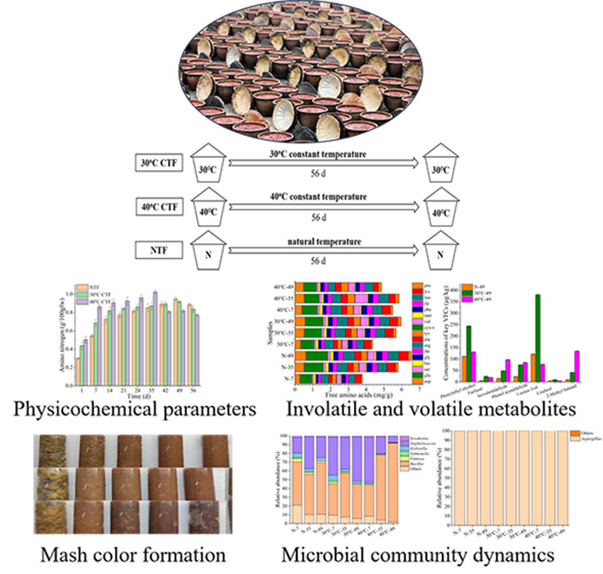 豆瓣酱历史悠久,深受我国和东南亚各国消费者的青睐,是人们生活中必不可少的调味品和副食品。然而,目前豆瓣酱仍然采用传统“日晒夜露”发酵方式,不同季节生产的豆瓣酱品质有一定差异,严重影响了豆瓣酱的产品品质。此外,由于目前豆瓣酱生产的机械化程度较低,导致生产效率较低,严重影响了行业的升级转型。团队前期已经系统分析了不同季节豆瓣酱的微生物群落演替及酱醅风味差异,发现其中温度是豆瓣酱微生物群落的季节差异化分布的重要因素。因此,阐明温度对豆瓣酱微生物群落结构与功能的影响具有重要意义。