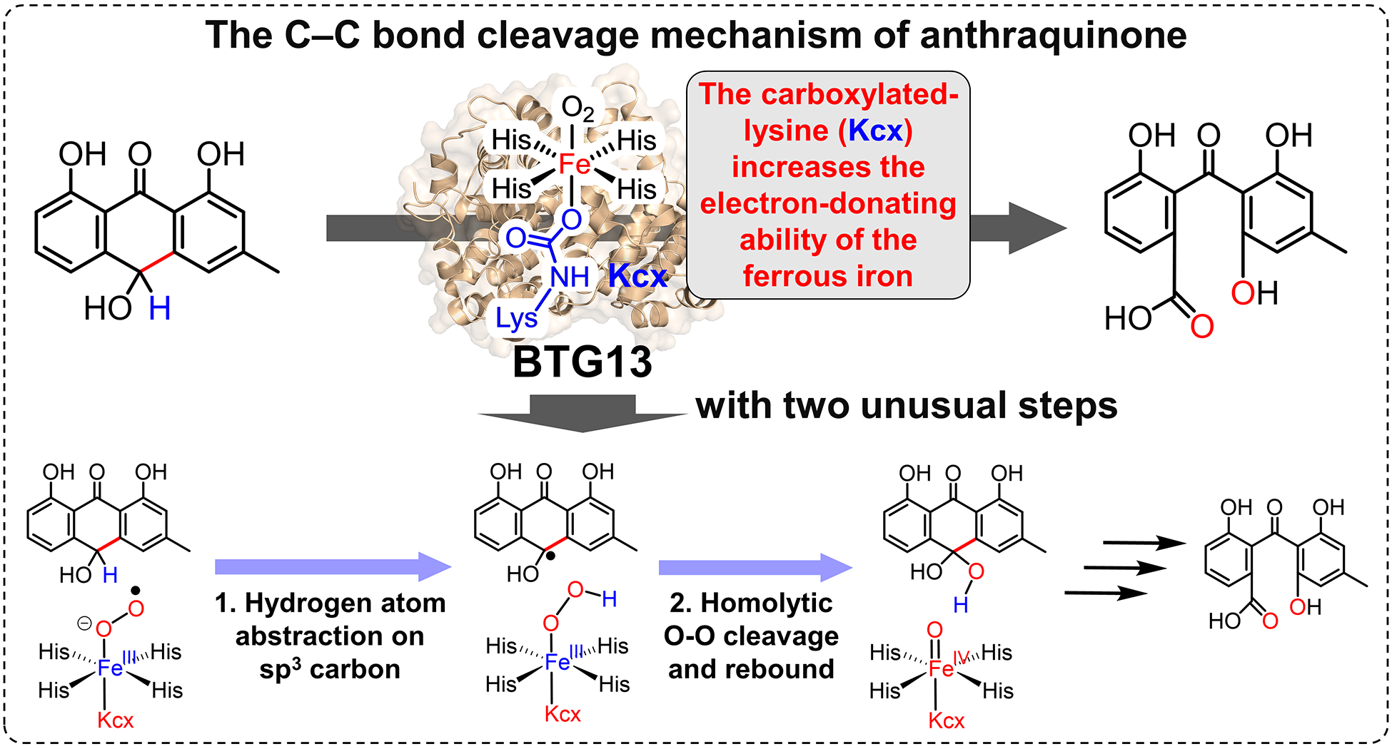 饶义剑教授团队报道了一种能够催化蒽醌C4a-C10键断裂的非典型非血红素铁依赖的双加氧酶BTG13(Angew. Chem. Int. Ed. 2022, 61, e202208772.)。晶体结构显示,BTG13具有罕见的四个组氨酸残基和一个羧化赖氨酸残基(Kcx)与亚铁离子形成的配位中心。由于该配位模式此前未被报导研究,因而Kcx在催化过程中的功能仍是未知,BTG13催化反应机理仍存在诸多疑团。