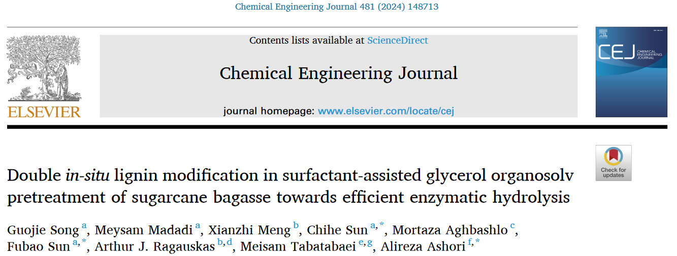 孙付保教授团队在研究先进预处理方法促进纤维质底物酶解制糖方面取得重要进展,研究成果“Double in-situ lignin modification in surfactant-assisted glycerol organosolv pretreatment of sugarcane bagasse towards efficient enzymatic hydrolysis”正式发表于Chemical Engineering Journal, 2024, 481:148713 (一区, Top, IF 15.1)