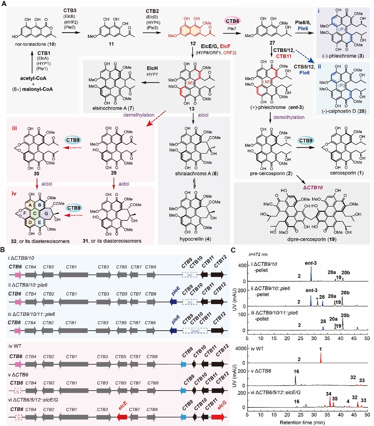 此外,作者对关键分支酶的底物混杂性进行了详细的测试,为其他非天然苝醌化合物的定向生物合成提供指导。