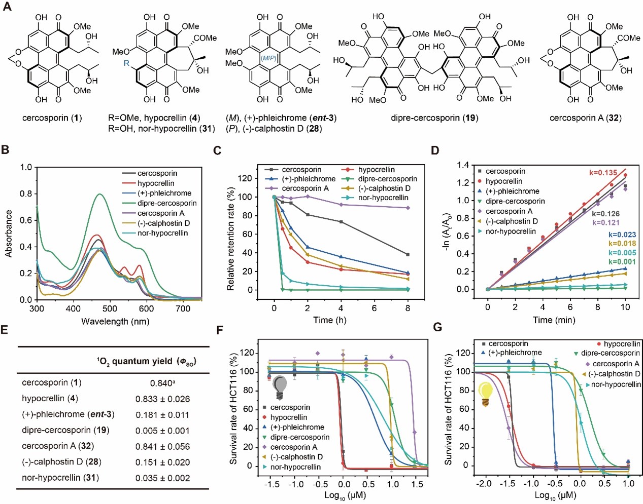 随后,作者选取了几种具有典型结构的天然或非天然苝醌化合物,从光物理学性质、单线态氧量子产率以及生物活性等方面考察了苝醌的化学结构对其光动力学特性的影响(图2)。结果表明,具有特殊骨架结构的苝醌化合物19在红光区的吸收明显增强;此外,与天然苝醌化合物相比,非天然苝醌化合物尾孢菌甲素不仅具有较高的光稳定性和显著降低的暗毒性,还保留了良好的光动力抑菌和抗癌活性。