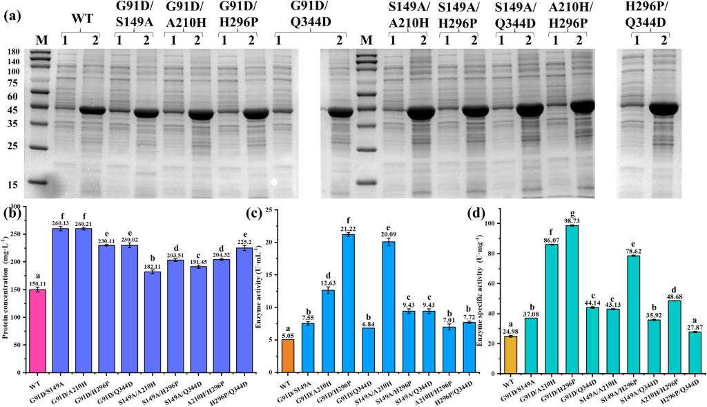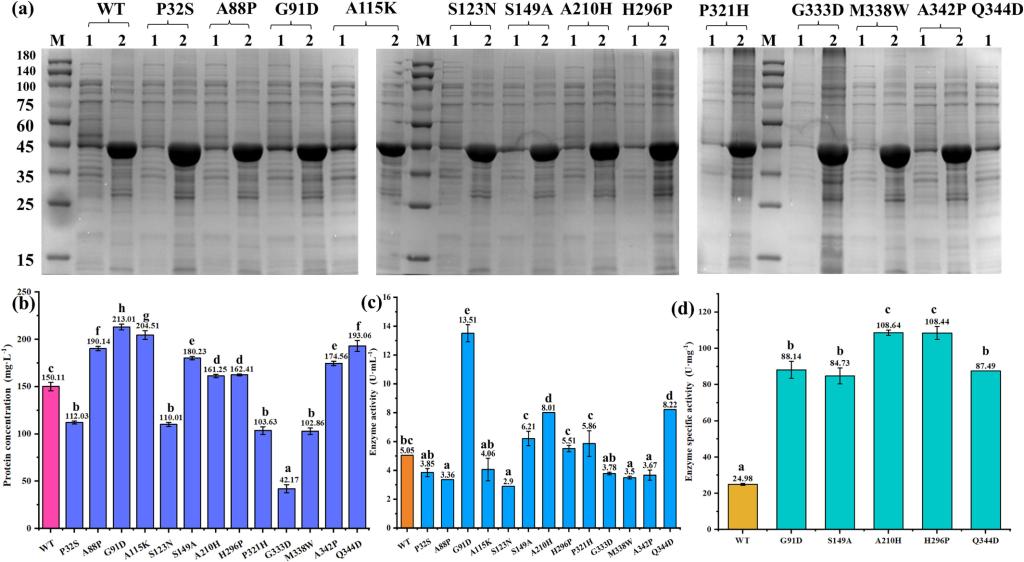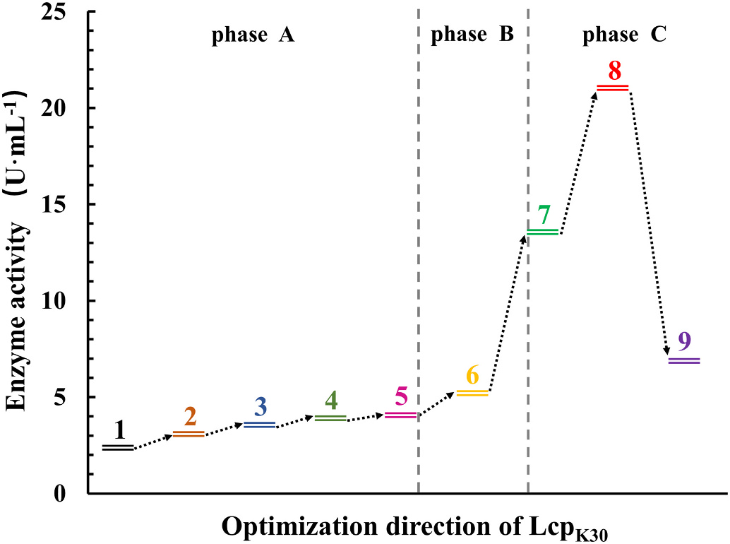 吴敬教授团队针对LcpK30在大肠杆菌E.coli BL21(DE3)中可溶性表达差的特点,采用发酵条件优化和酶分子改造联用策略提高了其可溶表达。发酵条件包括诱导条件、辅因子和化学伴侣物质的添加,分子改造采用PROSS服务器预测突变位点而开展。在本研究中,LcpK30最终在0.1 mM的IPTG诱导,辅因子添加终浓度为4 mM的ALA,1 mM的FeSO4,诱导温度25 ℃培养24 h 的优化条件下,发酵酶活达到3.81 U·mL-1。通过添加化学伴侣物质10 mM的甜菜碱,发酵酶活达到5.05 U·mL-1,是原始菌株的237.0%。通过PROSS服务器指导的位点突变,进一步增强了LcpK30目的蛋白的可溶性表达,在13个预测突变体中有8个蛋白表达增加(正向突变率为61.5%)(图1)。随后,通过叠加具有增强效果的蛋白表达和酶活性的单突变体,构建组合突变体。其中三个双突变体G91D/S149A、G91D/A210H和G91D/H296P的表达水平分别为野生型LcpK30的173.3%、173.3%和153.3%。这些突变体还表现出较高的发酵酶活性,分别达到野生型的149.5%、250.0%和420.2%,比活力也有所提高(图2)。相关研究中,化学伴侣物质的添加和分子改造对LcpK30表达最为显著(图3 phaseB和phaseC)。本研究为LcpK30的高效表达提供了参考,并为LcpK30之后的应用研究奠定了基础。