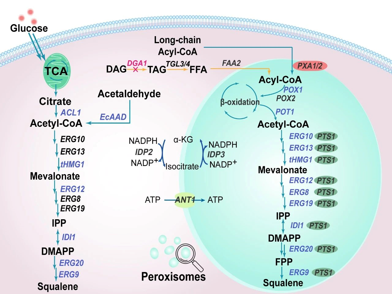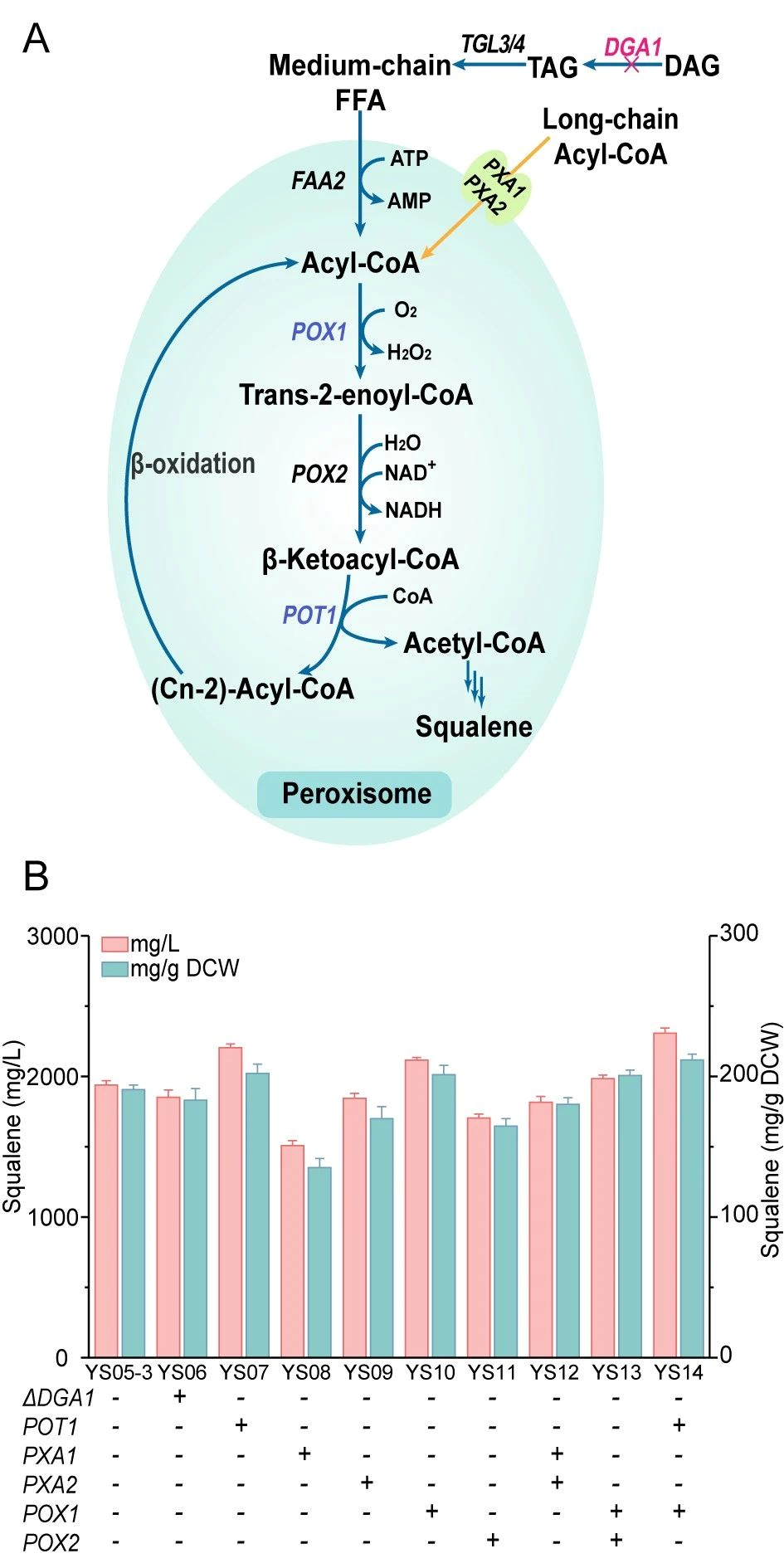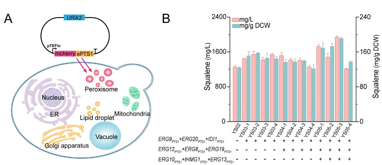 角鲨烯(Squalene)是一种高价值无环三萜化合物,常被用作抗氧化剂、抗肿瘤剂、疫苗佐剂等,广泛应用于食品、化妆品、医疗行业。角鲨烯可从鲨鱼肝油、橄榄、苋菜籽等动植物中分离获得,但由于动物保护法规以及植物中提取纯化的繁琐工艺,这类生产方式有很大的局限性。近年来,随着对基因编辑工具和代谢模型的不断挖掘,人们尝试在微生物中构建细胞工厂以持续、高效、安全的合成角鲨烯。然而,目前的研究中甲羟戊酸(MVA)途径碳通量不足、胞质中疏水性大分子储存空间有限、脂质合成和角鲨烯合成的竞争等因素限制角鲨烯在微生物中的高效合成。解脂酵母(Yarrowia lipolytica)是一种Crabtree阴性酵母,具有底物谱广、脂质含量丰富、适应高密度发酵等特点。解脂酵母的过氧化物酶体是利于角鲨烯储存的疏水性细胞区室,其中存在的β-氧化途径是产生乙酰辅酶A的重要代谢过程,因此,过氧化物酶体有潜力被开发为角鲨烯的“生产车间”。