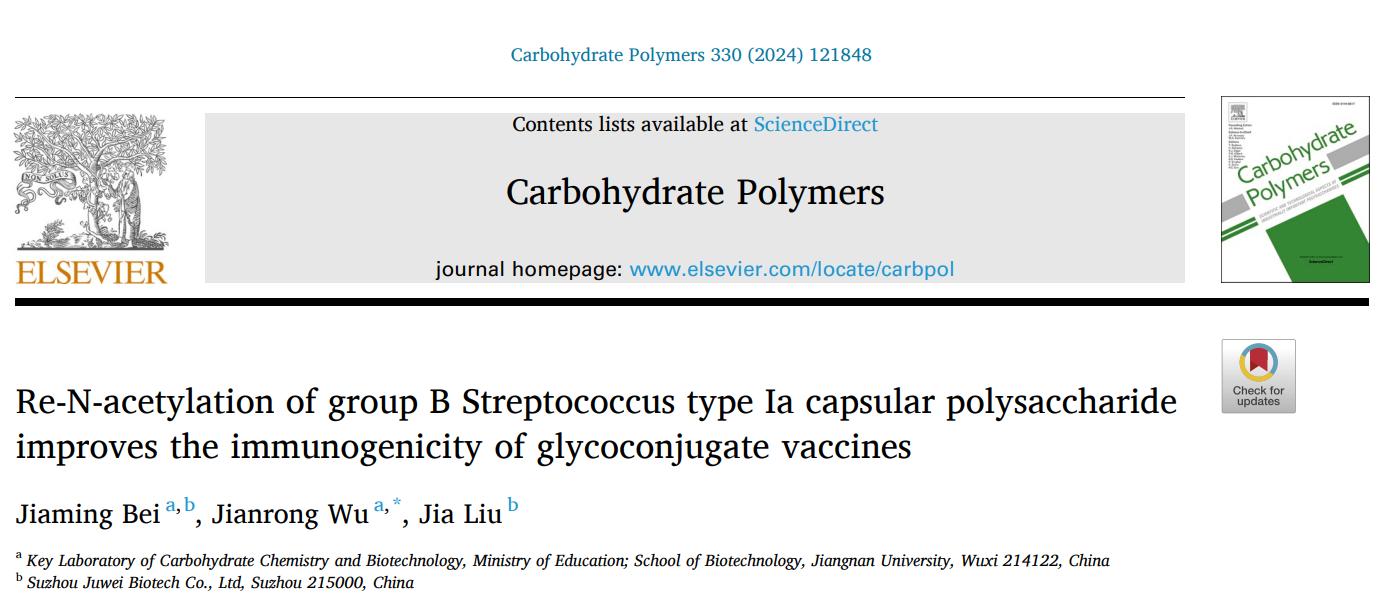 高敏杰团队吴剑荣老师在Ia型B族链球菌荚膜多糖的结构与功能方面研究取得重要进展,研究成果“Re-N-acetylation of group B Streptococcus type Ia capsular polysaccharide improves the immunogenicity of glycoconjugate vaccines”正式发表于Carbohydrate Polymers (IF = 11.2) ()。