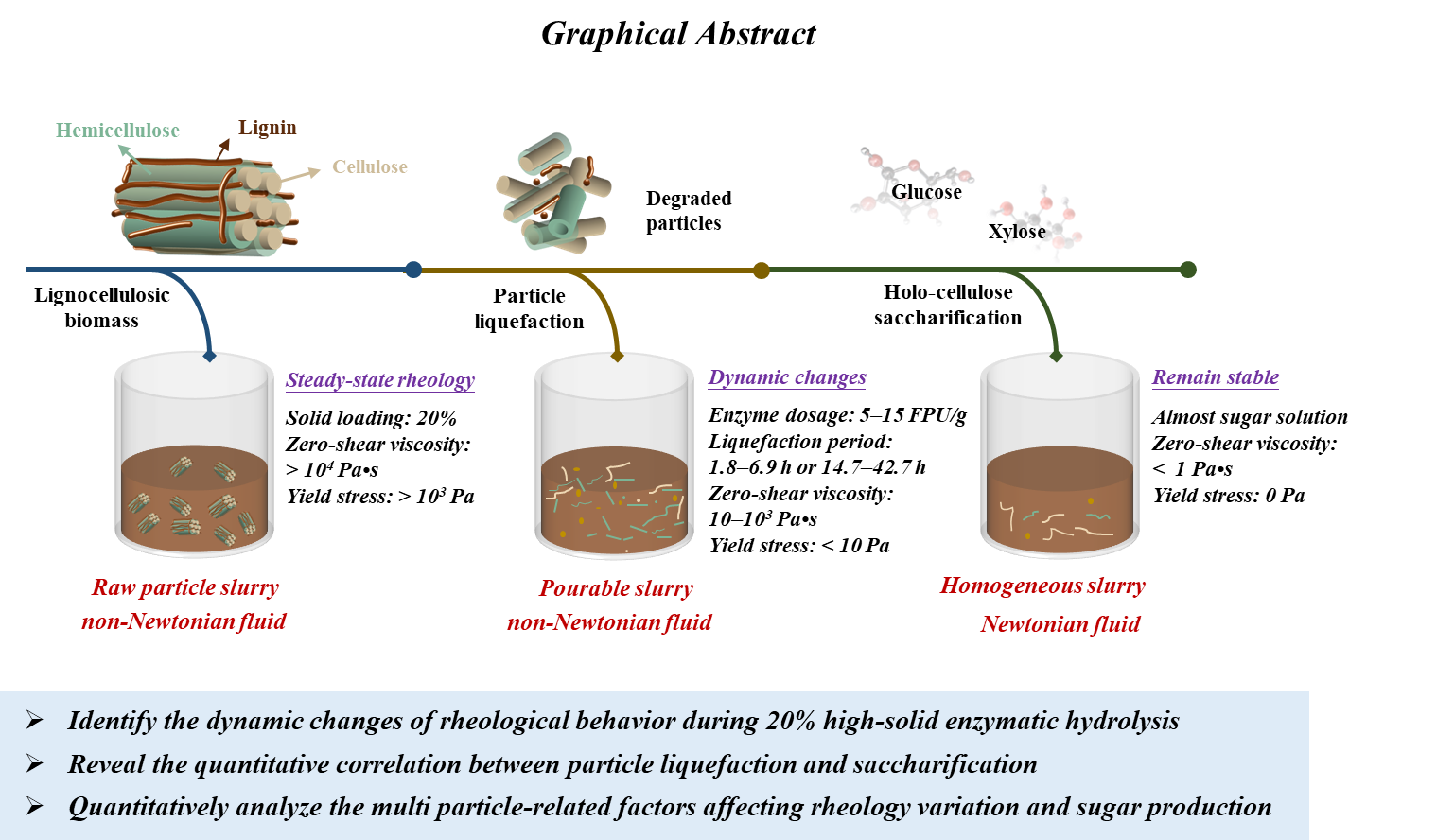 孙付保教授团队在木质纤维素生物质浓醪酶解糖化方面取得重要进展,研究成果“Quantitative correlation analysis between particle liquefaction and saccharification through dynamic changes of slurry rheological behavior and particle characteristics during high-solid enzymatic hydrolysis of sugarcane bagasse”正式发表于Bioresource Technology (IF = 11.3997) ()。