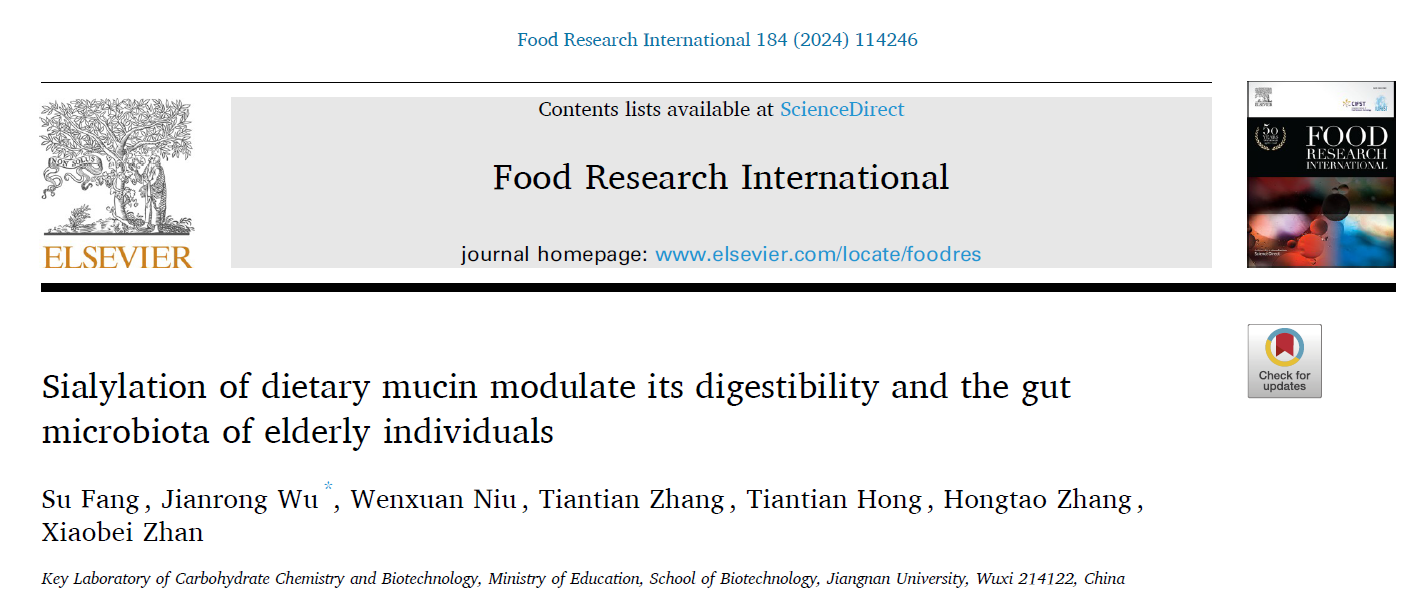 高敏杰团队吴剑荣老师在不同构型唾液酸影响老人肠道菌群群落组成和结构方面研究取得重要进展,研究成果“Sialylation of dietary mucin modulate its digestibility and the gut microbiota of elderly individuals”正式发表于Food Research International (Q1, IF=8.1) ()。
