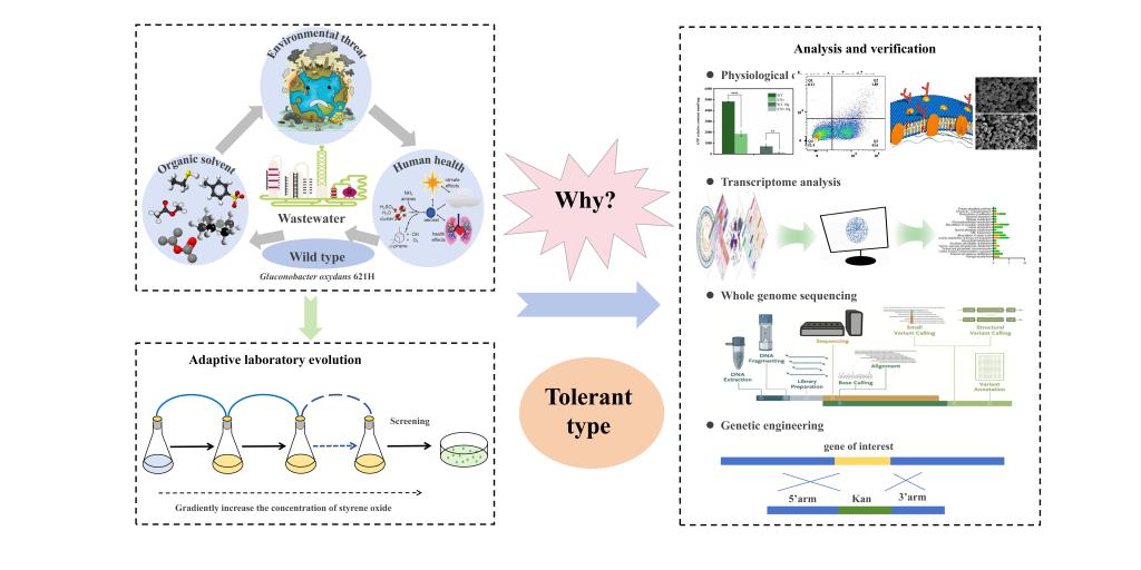 饶志明教授团队针对氧化葡萄糖酸杆菌对有机溶剂耐受性不高以及有机溶剂对微生物毒性作用的问题,采用适应性进化结合组学分析,并检测生理特性来解析对有机溶剂耐受性质。首先,开展了氧化葡萄糖酸杆菌对有机溶剂和底物(十六烷烃、DMSO、环氧苯乙烷)的耐受性试验,利用高通量筛选结合梯度顺序升压的驯化方法,最终获得了5株溶剂耐受能力提高的驯化株,其中驯化株G. oxydans STO生长最佳,能够耐受15 g·L-1环氧苯乙烷且对不同溶剂的综合耐受性较强(其对正丁醇、苯酚、三氯甲烷、甲苯、辛醇、环己烷、丙苯、环辛烷、萘烷、正癸烷,耐受性分别提高5.22、4.19、2.66、3.01、1.32、1.71、4.57、6.27、2.01、5.46倍)。接着从生理特征变化方面分析驯化菌株耐受有机溶剂的原因,发现驯化株经环氧苯乙烷适应性进化后保持低毒性状态,导致胞内ATP浓度降低,能量供给减少,不仅抑制细胞生长,还引起自身程序性死亡;积累在细胞膜上的有机溶剂,破坏了细胞膜完整性,并降低了通透性,导致内容物流出,细胞凋亡;此外细胞变得小而圆,减少了与溶剂接触面积,膜疏水性的提高同样避免了与有机溶剂的接触,赋予驯化株抵御有机溶剂胁迫能力。其次,以出发菌株未参考,结合转录组学与全基因组测序,挖掘驯化株中影响有机溶剂耐受性关键基因。结果分析显示,驯化株STO中共有111个基因显著性差异表达,其中有47个基因上调,64个基因下调。RNA-seq数据验证了细胞外排相关基因和双组分调节系统相关基因表达上调,证实进化菌株的细胞外排转运作用强于野生型。此外,细菌的鞭毛系统也积极参与了对有机溶剂毒性的抵抗。最后,通过基因敲除和过表达,对转录组数据和微生物重测序中挖掘的关键基因GOX_RS04415、GOX_RS04560、GOX_RS04700、GOX_RS07790 和 GOX_RS12365 进行了初步验证。结果表明,GOX_RS04415 和 GOX_RS04700 在G. oxydans抵御有机溶剂胁迫中起一定作用。并进一步验证GOX_RS04415和GOX_RS04700可能分别通过影响G. oxydans的形态和生物膜形成能力来调控有机溶剂耐受性。本研究为耐有机溶剂底盘微生物的构建以及生物催化领域的应用拓展提供了重要支撑,在理论和应用方面都具有重要价值。