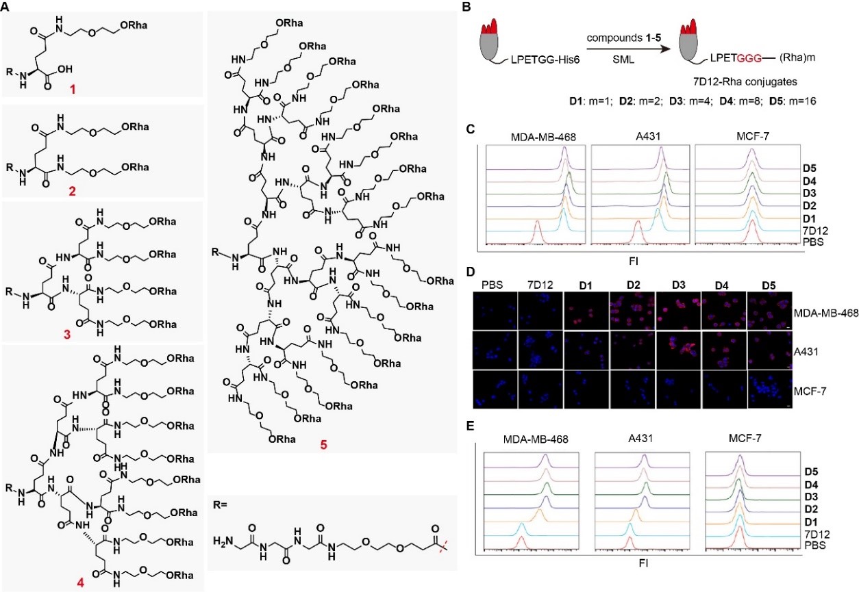 在这项工作中,研究团队首先合成了5种含不同Rha价态的化合物1-5(图2A),并通过Sortase A介导的连接反应(Sortase A-mediated ligation,SML)将它们分别修饰到EGFR纳米抗体7D12的C末端,获得了相应的7D12-单价Rha偶联物D1,和7D12-多价Rha偶联物D2-D5(图2B)。亲和实验和抗体募集实验结果显示,5种偶联物均保留了良好的EGFR特异性识别能力(图2C),且能够选择性地将抗Rha抗体重定向至靶细胞表面(图2D-E)。