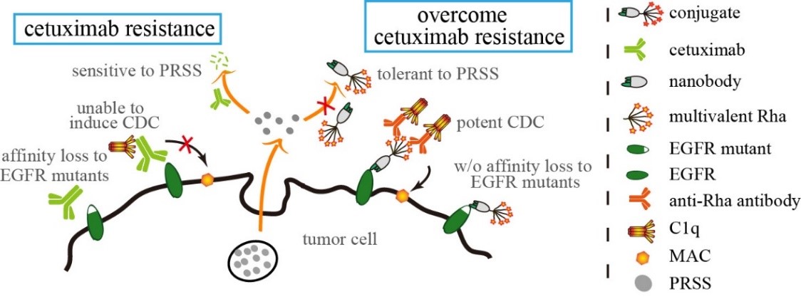 该研究利用糖生物学研究中鼠李糖(Rhamnose, Rha)的“多价效应”,基于化学酶法制备了一系列具有增强Fc效应功能的纳米抗体-多价Rha偶联物,并解析了其逆转西妥昔单抗耐药性的机制和效果(图1)。这一研究为耐药患者的治疗策略开发提供了新的思路。