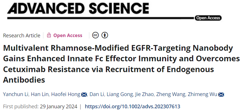 吴志猛教授团队在抗体偶联药物方面取得重要进展,研究成果“Multivalent Rhamnose-Modified EGFR-Targeting Nanobody Gains Enhanced Innate Fc Effector Immunity and Overcomes Cetuximab Resistance via Recruitment of Endogenous Antibodies”正式发表于Advanced Science (IF=15.1) ( )。