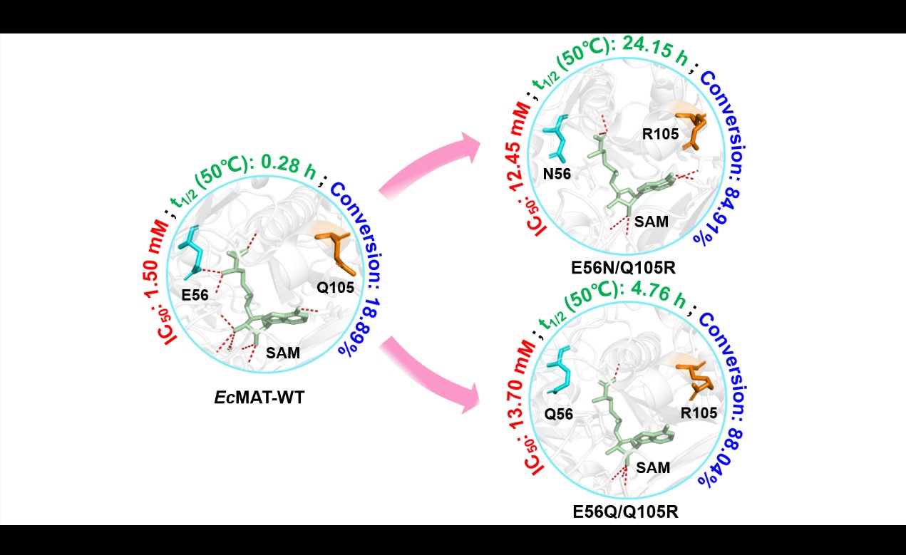倪晔-韩瑞枝教授团队针对大肠杆菌(EcMAT)中的MAT进行了结构引导半工程,以减轻其产物的抑制作用。与野生型EcMAT相比,最佳变异E56Q/Q105R的半数最大抑制浓度增加了8.13倍,转化率(150 mM ATP和L-蛋氨酸)增加了4.46倍,SAM产量为47.02 g/L。另一种变体E56N/Q105R表现出优异的热稳定性,半衰期(50°C)值增加了85.30倍。E56N/Q105R在50 mM、100 mM、150 mM底物浓度下的最高转化率分别为84.91%、77.52%、73.79%(16.92 g/L,30.89 g/L,44.10 g/L );E56Q/Q105R的最高转化率分别为88.04%、82.55%、78.67%(17.54 g/L,32.89 g/L,47.02 g/L)。此外,MD模拟结果表明,产品抑制效果的减轻可归因于促进产品释放。本研究提供了对减轻产物抑制的分子见解,并为工程MAT提高催化性能提供了有价值的指导,同时为绿色、高效的SAM大规模合成提供了可能。
