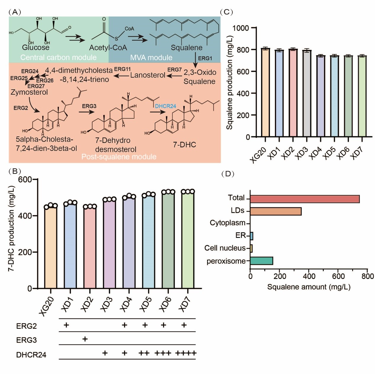 针对上述问题,该研究以前期一株可以合成7-DHC的酿酒酵母菌株为研究对象,首先,通过差速离心和可视化等技术,揭示了7-DHC的关键前体角鲨烯主要被封存在脂滴中(图1),而将角鲨烯转化为7-DHC的后角鲨烯途径的相关酶主要位于内质网中(图2),推测限制7-DHC高效合成的关键因素是脂滴对角鲨烯的封存作用;为此,本研究在脂滴中重构了后角鲨烯途径,获取的重组菌株胞内角鲨烯的含量降低了97%,摇瓶水平7-DHC的产量提升至684.1 mg/L(图3)。后续研究发现,后角鲨烯途径在脂滴中的重构会促使7-DHC在脂滴中贮存,这种贮存可以有效降低胞质7-DHC累积对细胞造成的毒害。为此,本研究一方面通过敲除TGL3减弱三酰基甘油降解,以增大脂滴中7-DHC的可储存空间,另一方面过表达ARE2加强酯化作用,以引导7-DHC更高效地储存于脂滴中,获得的重组菌株7-DHC的产量达到792.9 mg/L(图4);最后,结合辅因子平衡优化,7-DHC在摇瓶水平的产量达到867.6 mg/L,3-L发酵罐中的产量达到5.1 g/L,这是迄今为止报道的最高产量(图5)。相关研究成果为构建可高效合成固醇类化合物的细胞工厂提供了重要参考。