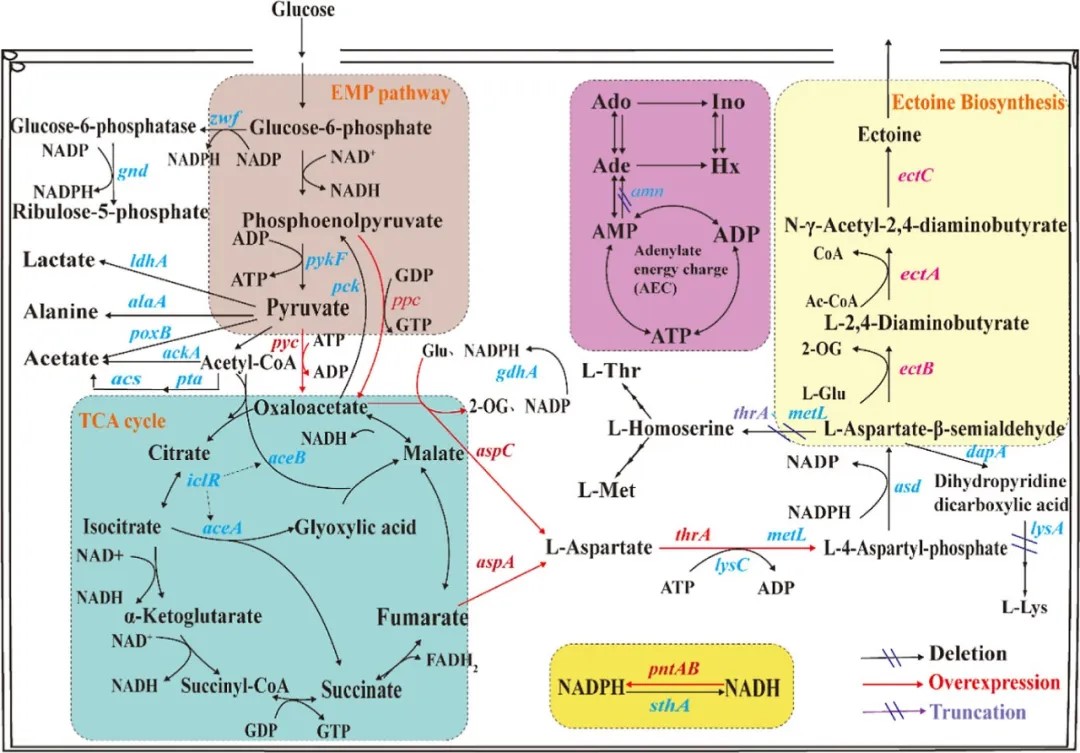 在生物工程、化妆品、医药和食品工业中,依克多因作为一种有价值的相容性溶质,因其在抵抗渗透压、稳定核酸、蛋白质和细胞膜结构以及保护生物大分子免受水解等方面的显著功能而受到重视。尽管某些嗜盐细菌能够自然产生依克多因,但作为生物制造的模型生物,大肠杆菌在经过代谢工程改造后,展现出了高效生产依克多因的巨大潜力。然而,复杂的代谢通量分布和小副产品形成限制了大肠杆菌中依克多因的生产。