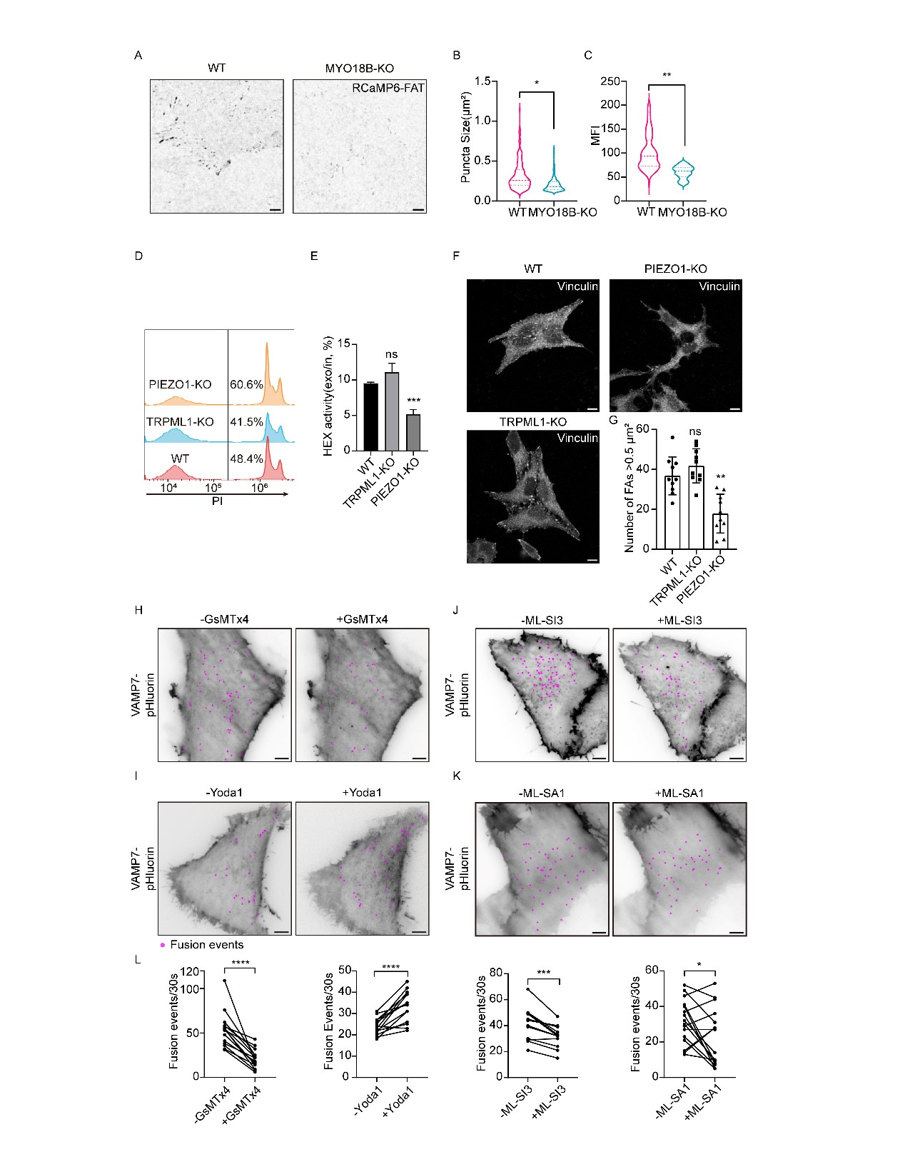 总之,本研究展示了由溶酶体糖苷水解酶(包括HEXA和HEXB)生成的、由截短型甘露糖修饰的蛋白质,这些蛋白质属于一种研究较少的截短型N-糖链,并通过溶酶体分泌暴露于细胞表面。通过全面的基因组敲除筛选,本研究确定了MYO18B作为这一过程的关键调节因子。此外,本研究还发现,溶酶体分泌主要发生在黏着斑(FAs)附近,而不是随机分布在质膜上。作为一种肌动蛋白交联蛋白,MYO18B本身促进压力纤维的组装,这对于FA成熟至关重要。溶酶体分泌精确地局限于FA附近,归因于两个主要因素:溶酶体向FA的靶向运输,这一过程依赖于微管和FA的相互作用;以及MSC(如PIEZO1)的激活,这些通道在FA处被局部激活,导入外源Ca²⁺,这一Ca²⁺对于溶酶体与质膜的融合是必不可少的(图6)。