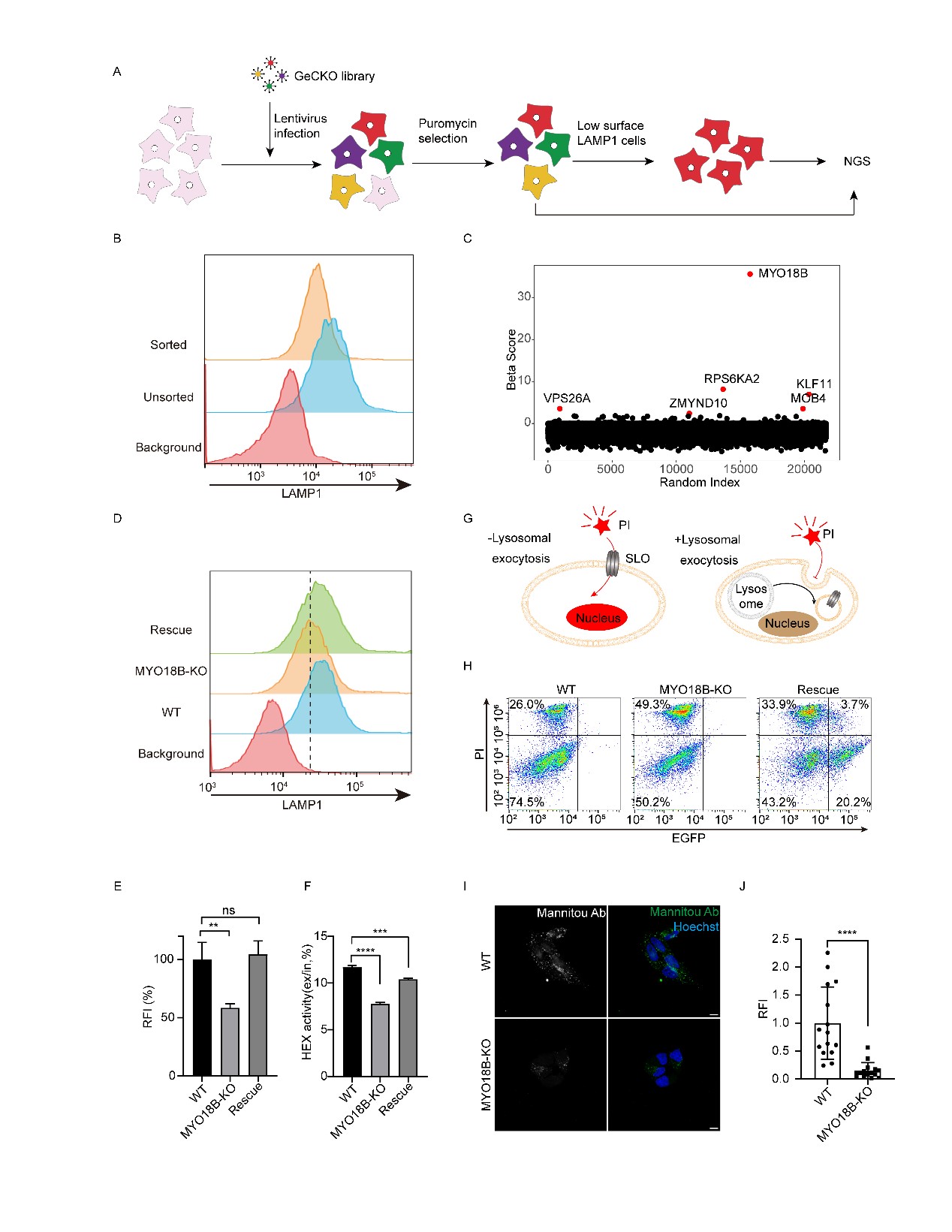 图2 基因组全基因敲除筛选确定MYO18B为溶酶体分泌的关键调节因子
