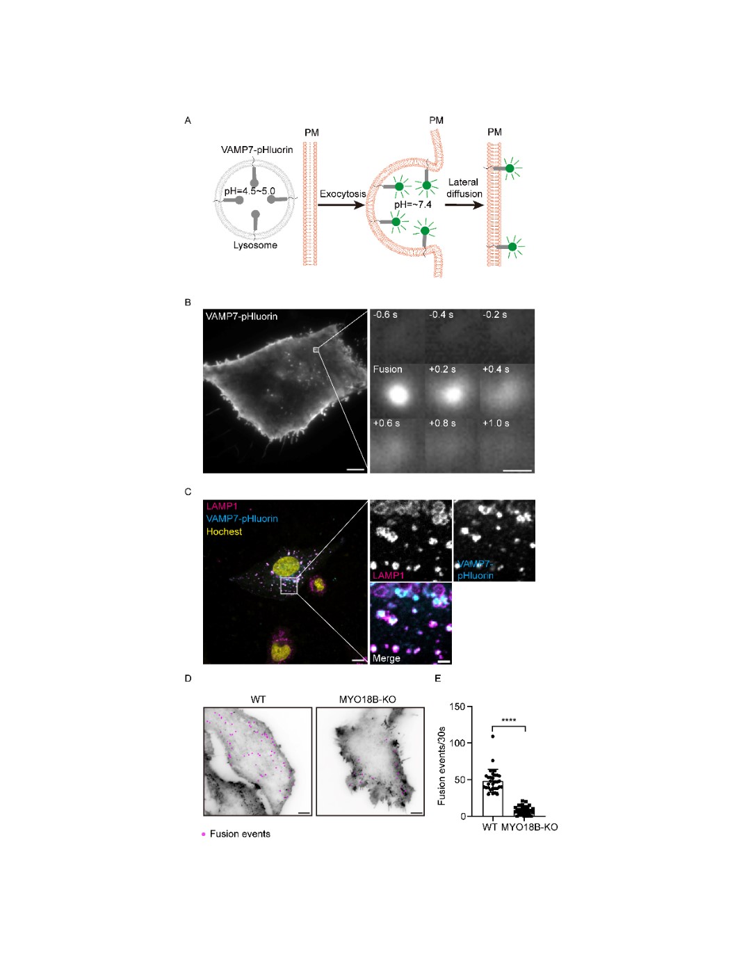 随后,通过CRISPR/Cas9的全基因组敲除筛选,发现在MYO18B敲除的细胞中,LAMP1的细胞表面水平显著降低;而重新表达EGFP标记的MYO18B后,LAMP1的表达水平得到了恢复。此外,溶酶体酶HEX的分泌在MYO18B敲除细胞中显著减少,这进一步表明溶酶体分泌在MYO18B缺失的情况下受到抑制。通过一种基于细胞膜修复的实验(使用溶血素O诱导膜损伤),作者发现MYO18B敲除细胞修复膜损伤的能力显著下降,而恢复MYO18B表达后,这一能力得到了部分恢复。这表明MYO18B在溶酶体分泌过程中起着重要作用(图2)。为了直接监测溶酶体分泌,本研究使用了VAMP7-pHluorin融合蛋白。pHluorin在溶酶体内的酸性环境中荧光被淬灭,但当溶酶体与质膜融合时,内外pH值中和,导致荧光发射。在野生型(WT)细胞中,观察到了频繁的溶酶体融合事件。然而,在MYO18B敲除(KO)细胞中,使用该方法观察到溶酶体与质膜的融合事件显著减少。这些观察结果进一步支持了MYO18B作为溶酶体分泌正调节因子的作用(图3)。
