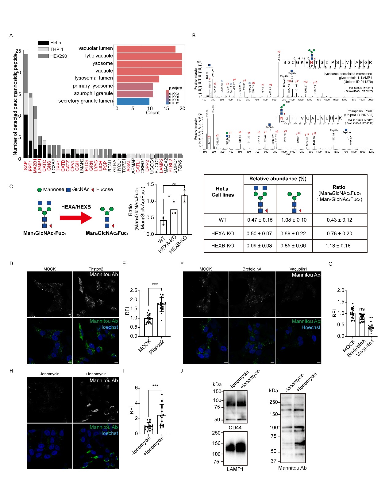 为了阐明上述机制,本研究首先在三种人类细胞系(HeLa、人单核白血病细胞THP-1、人胚肾细胞HEK293)中进行了糖蛋白质组分析。分析检测到分别来自HeLa、THP-1和HEK293细胞的202、133和189种糖蛋白。大部分截短型甘露糖蛋白源自溶酶体 (61.7%),包括溶酶体膜蛋白(如LAMP1)和可溶性蛋白(如PSAP)。为了验证截短型甘露糖的生成机制,作者在HeLa细胞中分别敲除HEX α和β亚基基因 (HEXA 和 HEXB)。敲除这些基因后,截短型甘露糖前体与最终截短型甘露糖的比例显著上升,表明溶酶体内的HEX在截短型甘露糖生成中发挥了重要作用。