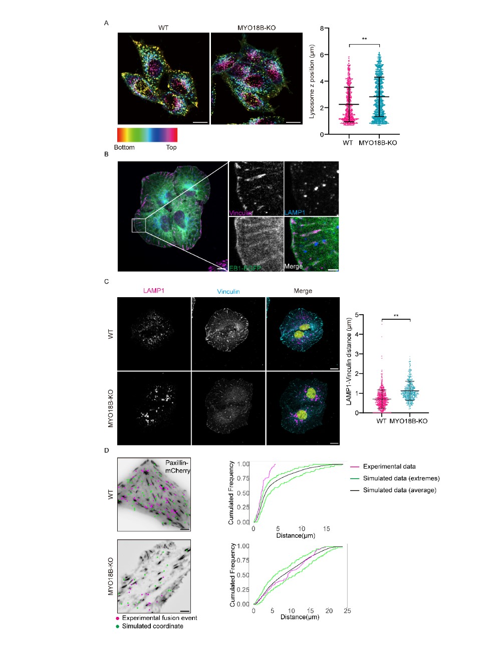 MYO18B是一种非常规的肌球蛋白,由2,567个氨基酸残基组成。其中心区域,跨越氨基酸残基555至2,089,展示了肌球蛋白II的典型结构,包括一个由于氨基酸替换而功能失活的马达域、两个IQ结构域(促进与肌球蛋白轻链的相互作用)和一个对于同源二聚体形成至关重要的卷曲螺旋结构域。MYO18A和MYO18B是肌球蛋白XVIII家族的成员,具有相似的中心区域,但N端和C端有所不同。MYO18A有三种亚型:MYO18Aα(广泛表达)、MYO18Aβ(在造血细胞中表达)和MYO18Aγ(在心脏和骨骼肌中表达)(Taft和Latham, 2020)。为了研究MYO18A是否具有与MYO18B类似的功能,本研究在HeLa和U2OS细胞中敲除了广泛表达的MYO18Aα亚型。出乎意料的是,与MYO18B-KO细胞不同,MYO18Aα-KO细胞的细胞表面LAMP1水平与野生型细胞相当。敲除MYO18Aα实际上增强了溶酶体分泌,而不是抑制它且溶酶体分泌发生在黏着斑(FAs)附近(图4)。