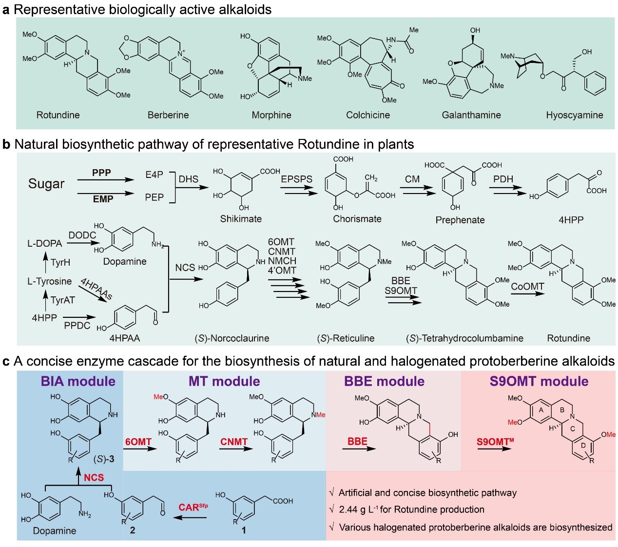 饶义剑教授团队在创建中药延胡索活性成分罗通定的生物合成和仿生改造新方法方面取得重要进展,研究成果“A concise enzyme cascade enables the manufacture of