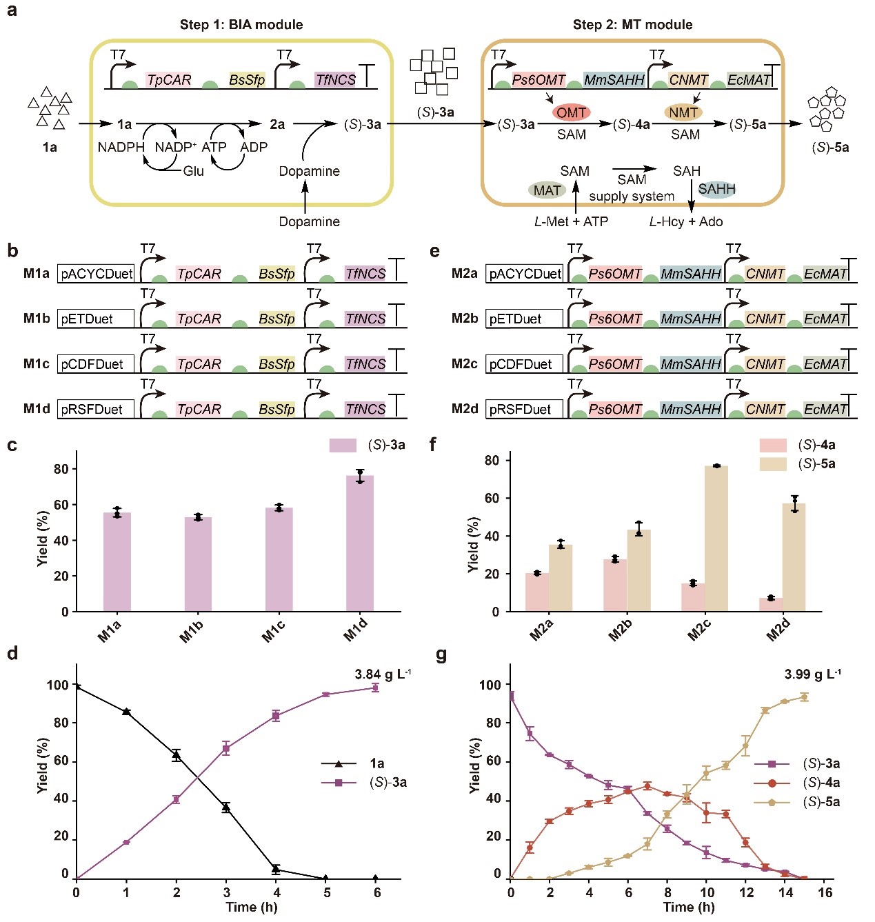 首先基于原小檗碱类生物碱的天然合成途径及该团队先前报道的苯乙基异喹啉生物合成平台,设计了一条以罗通定为代表的原小檗碱类生物碱及其卤代衍生物的多酶级联反应新途径。如图1c所示,该人工合成途径通过投喂廉价易得的底物(苯乙酸衍生物),依次经过脱羧、P-S缩合、6-氧甲基化、N-甲基化、碳碳偶联、9-氧甲基化和2-氧甲基化等步骤,最终生成目标产物。该途径由四个模块组成:BIA模块、MT模块、BBE模块和9OMT模块,从廉价易得的底物出发,高效地合成了原小檗碱类生物碱。通过巧妙的底物设计,该级联反应系统避免了原始反应途径中NMCH和4’OMT的参与,从而显著缩短了反应步骤并提高了催化效率。
