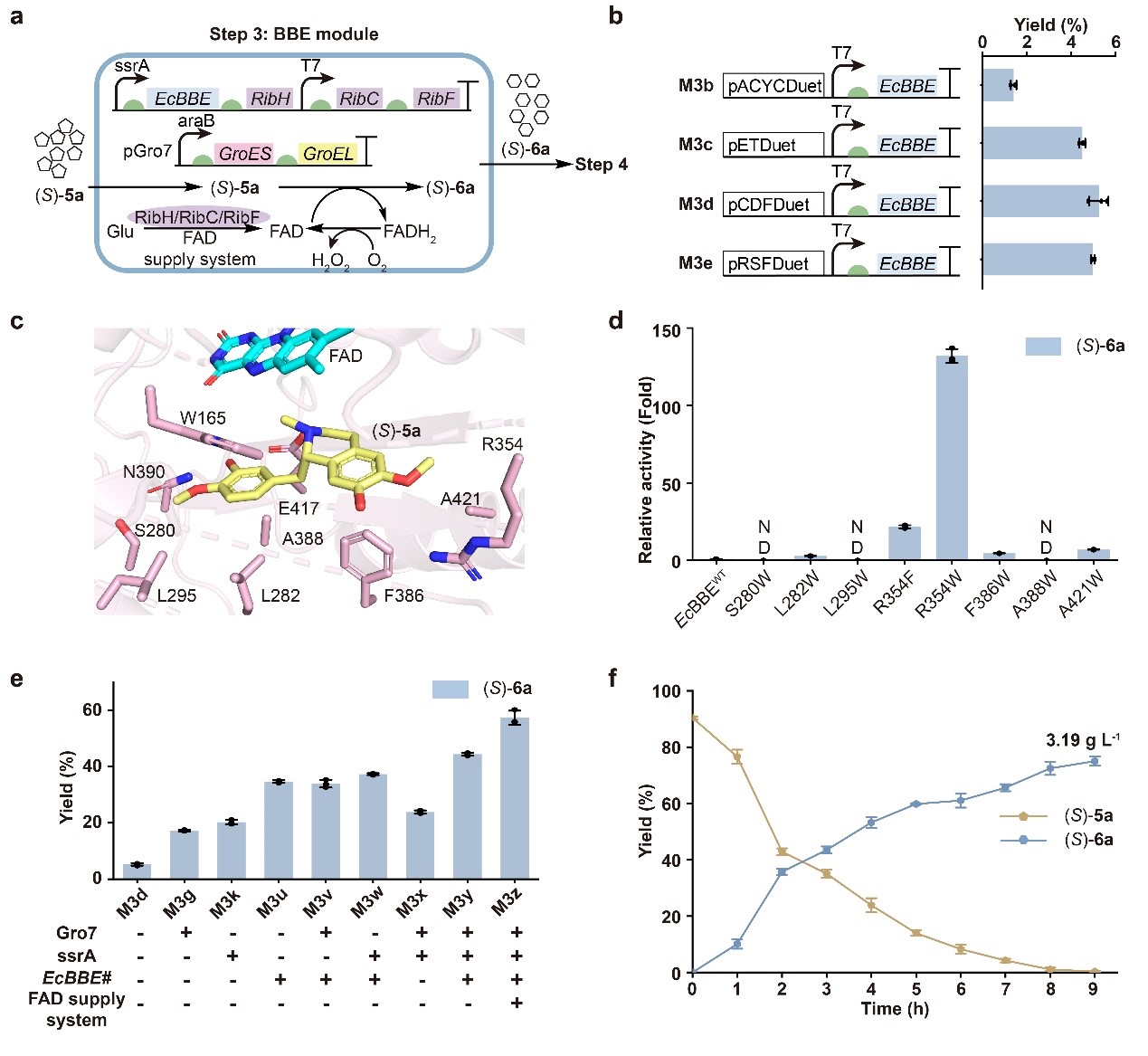 接着,作者在全细胞体系中构建了多酶级联反应途径(图3),并通过分子伴侣、启动子工程、定向进化和辅因子工程等手段,系统地优化了小檗碱桥酶BBE的表达水平及其催化性能,有效解决了原小檗碱类生物碱生物合成中小檗碱桥酶催化活性差的固有难题(图4)。随后,基于结构指导,作者对S9OMT进行了定向进化,在保持其对9-OH高效甲基化的同时,显著提高了其对2-OH的甲基化能力。通过上述途径构建、酶改造及条件优化,罗通定的产量达到了2.44 g/L,这是目前文献报道中的最高产量。