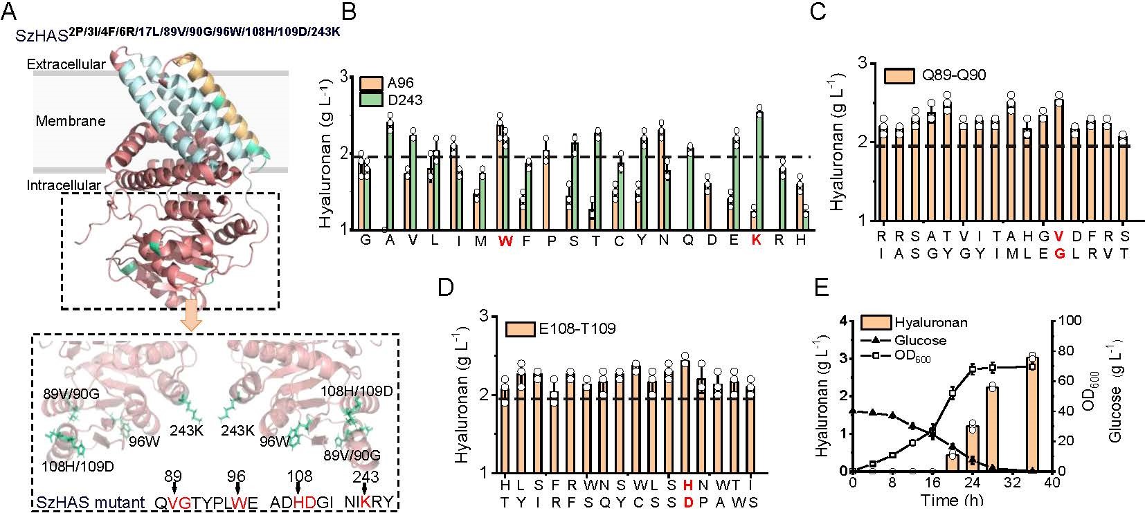 然后,作者基于结构预测,针对SzHAS催化域中12个非保守位点进行系统性突变筛选,经筛选发现,Q89V/Q90G、A96W、E108H/T109D和D243K突变可显著提高HA产量。在突变株SzHAS2P/3I/4F/6R/17L基础上构建突变体SzHAS2P/3I/4F/6R/17L/89V/90G/96W/108H/109D/243K,其HA合成能力得到显著增强,较基础突变株提升50%。