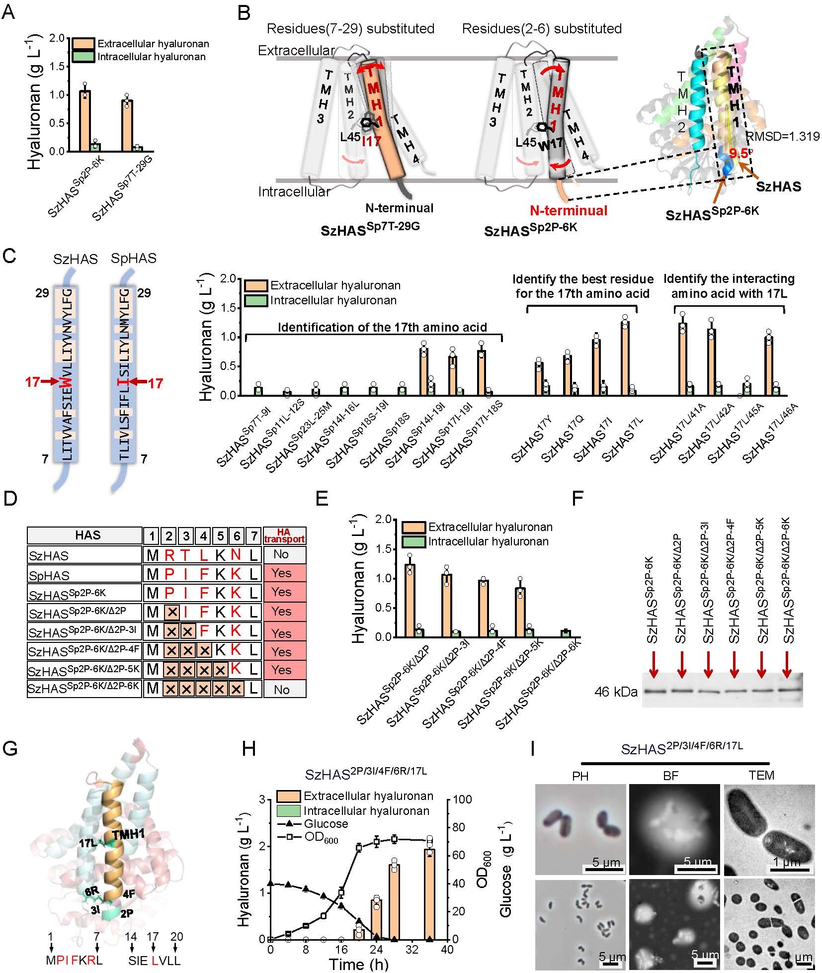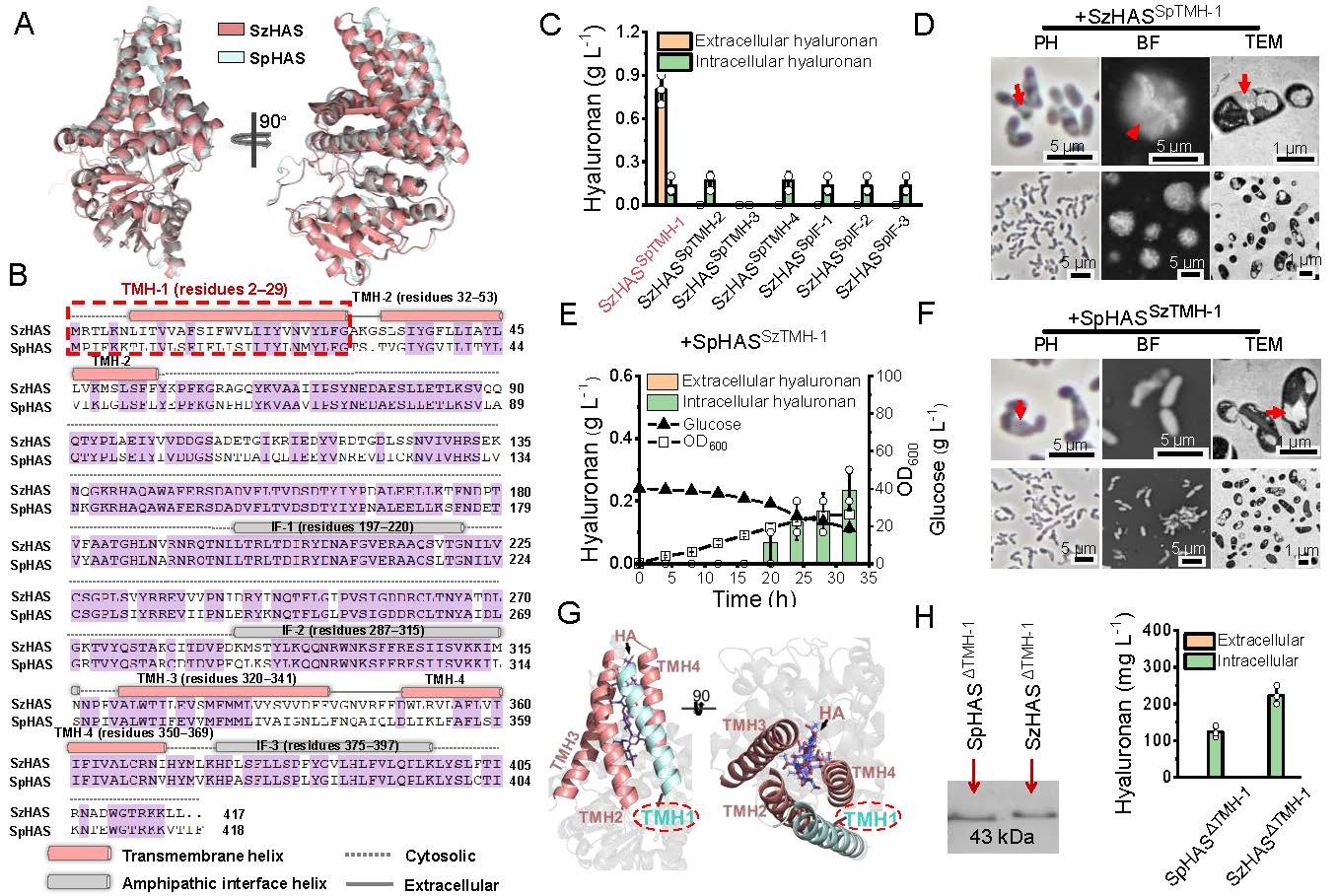 化脓性链球菌来源HAS(SpHAS)与SzHAS结构和氨基酸序列高度相似,但在谷氨酸棒状杆菌中,SpHAS能实现HA的合成与分泌,表明HAS序列差异对其构象及功能具有重要影响。为解析关键结构域,将SzHAS跨膜螺旋TMH-1替换为SpHAS对应片段,突变体SzHASSpTMH-1恢复了HA分泌能力。AlphaFold2结构模拟显示,TMH-1不直接参与跨膜通道构建,其缺失不影响聚合活性但调控HA分泌。研究表明,TMH-1通过与TMH-2相互作用调节跨膜通道构象,从而影响HA转运。