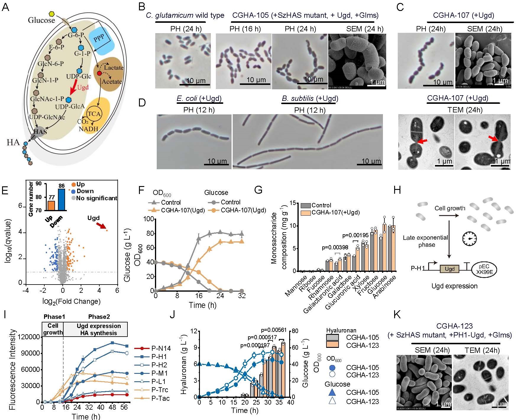 强化HA前体合成途径UDP-葡萄糖脱氢酶基因ugd可提升UDP-葡萄糖醛酸供应,显著增强HA合成能力。然而,ugd过表达导致谷氨酸棒杆菌及其他宿主(如大肠杆菌、枯草芽孢杆菌)出现棒杆状-链状形态转变。透射电镜分析表明,链状形态源于细胞分裂不完全。细胞糖组成分析显示,细胞壁中含葡萄糖醛酸的多糖含量异常升高,推测Ugd过表达改变了细胞壁组分,影响细胞分裂。此外,HA合成主要集中在对数生长期后期,而细胞形态变化发生在对数生长前期。为协调细胞生长与产物合成,作者采用指数后期响应型启动子,并通过启动子工程改造获得高强度启动子PH1动态调控UDP-葡萄糖脱氢酶表达,显著提升HA摇瓶产量,同时维持正常细胞形态与高密度生长。