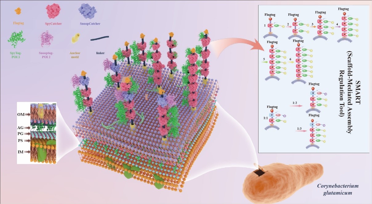 饶志明教授团队以兼具食品安全和工业鲁棒属性的谷氨酸棒杆菌(Corynebacterium glutamicum)作为开展新型生物催化平台研究的底盘细胞,开发了一种名为Scaffold-Mediated Assembly Regulation Tool (SMART)的新型可编程平台,SMART平台整合双Catcher/Tag对(SpyCatcher/SpyTag和SnoopCatcher/SnoopTag)构建可控分子比例和高负载能力的交联蛋白支架,实现多酶催化剂在C. glutamicum表面的精确控制组装。首先,基于锚定基序适配性筛选策略,利用共价偶联元件SpyCatcher/SpyTag的特异性识别能力,组合使用荧光免疫细胞分析-蛋白定位表达、流式细胞分析、荧光探针成像等技术,研究团队在细胞外膜霉菌酸层中开发了一种孔蛋白PorB驱动的由SpyCatcher结构域组成的基础锚定单元。紧接着通过计算机辅助设计和实验验证对该系统进行优化升级,SMART 将双Catcher/Tag对集成在一起,创建了双功能嵌合支架和长串联重复序列以优化酶负载,解决细胞表面多酶组装面临比例失调和负载能力弱的痛点问题。随后,为了进一步实现在单个细胞内对酶和支架表达进行时空调控,进一步集成优化了基于Bxb1重组酶的状态机(RSM)遗传电路,促使多酶组装能够响应催化过程需求。最后,研究团队测试了SMART平台在不同场景中的应用。该平台不仅在麦芽糊精转化为海藻糖的两步级联反应中相较于游离催化体系催化效率提高22%,也在异麦芽酮糖生产中展示出其工业应用潜力,时空转化效率相较于全细胞催化剂提升近5倍。这项研究为多酶级联反应提供了较高的灵活性和效率,并有望在多种生物催化剂中得到拓展。