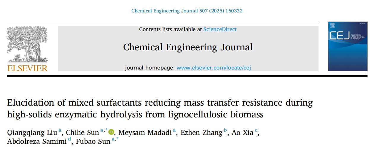生物资源与生物炼制研究团队在混合助剂协同强化纤维质底物浓醪酶水解过程中扩散传质的机理方面取得重要研究进展,研究成果“Elucidation of mixed surfactants reducing mass transfer resistance during high-solids enzymatic hydrolysis from lignocellulosic biomass”正式发表于Chemical Engineering Journal(一区, Top, IF 13.4)。