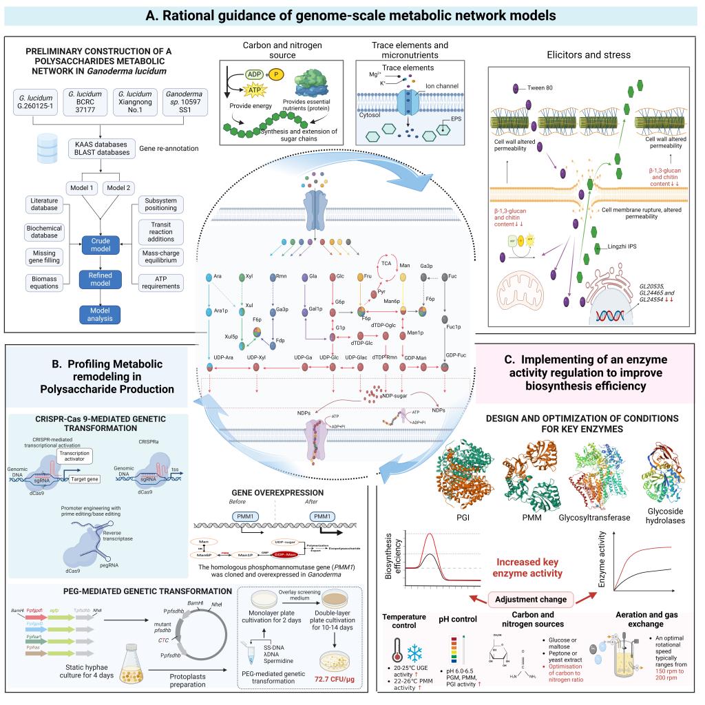在合成机制层面,系统归纳了食药用真菌多糖合成过程中关键酶的类型及功能,包括磷酸葡萄糖变位酶、尿苷二磷酸葡萄糖焦磷酸化酶、葡萄糖-6-磷酸异构酶等糖供体生成相关酶,以及直接决定糖苷键连接方式的糖基转移酶(GTs);依托基因组尺度代谢建模,结合转录组与代谢组多组学数据,提出了面向特定结构的合成通路优化策略;总结了催化效率提升与底物特异性重构的方法,为实现结构可控、多样化多糖合成提供理论支撑。在遗传调控层面,尽管CRISPR/Cas9等新一代工具在模式真菌中取得良好应用,但受限于真菌细胞壁屏障、感受态发生条件苛刻以及宿主应激响应等因素,在食药用真菌中仍面临遗传转化效率低、表达体系不稳定等难点;构建高效、广谱适用的食药用真菌遗传转化体系不仅是提升目标基因表达与功能验证效率的关键,更是推动食药用真菌多糖研究向“功能导向-结构可控-平台化表达”协同发展的技术基础。