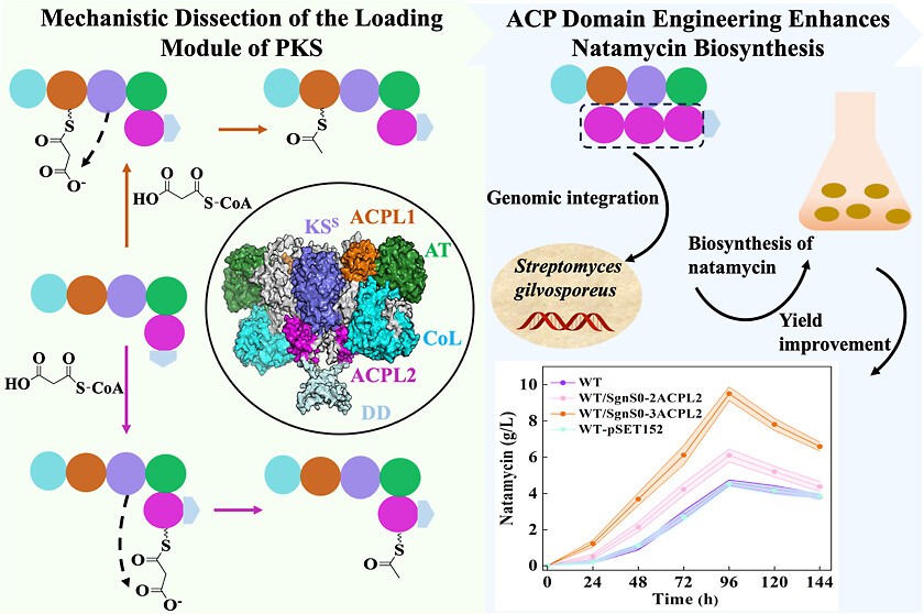 张荣珍教授团队在聚酮合酶的机制解析及高效合成纳他霉素方面取得重要进展,研究成果“Mechanistic Dissection of the Loading Module of PKS: ACP Domain Engineering Enhances Natamycin Biosynthesis in Streptomyces gilvosporeus”正式发表于ACS Catalysis (IF = 13.1) ()。
