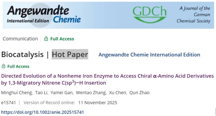 赵群教授团队成功将非天然的氮宾迁移反应机制引入金属酶催化体系,实现了酶促法合成手性非天然氨基酸,研究成果以“Directed Evolution of a Nonheme Iron Enzyme to Access Chiral α-Amino Acid Derivatives by 1,3-Migratory Nitrene C(sp3)─H Insertion为题正式发表于Angewandte Chemie International Edition(IF = 17),该工作入选Angewandte当期的 “Hot Paper”。