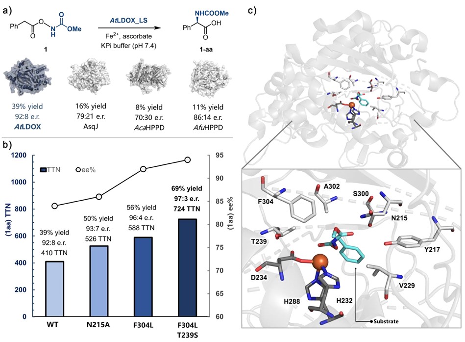 通过分子对接等手段,研究人员确定了在底物结合口袋的多个结合位点进行突变,最终发现突变体(AtLDOX_FL)对反应表现出优异的催化活性和立体选择性。工程化改造后的LDOX不仅能够适用于催化多种取代基的芳香族底物(卤素/甲氧基/甲基等取代基),还能够适配如噻吩等的杂环体系,这些底物均能以较高收率和对映体选择性转化为相应的手性α-氨基酸衍生物,产率高达81%,TTN高达808,对映体选择性高达98/2。本研究利用定向进化策略改造非血红素铁酶,实现了立体选择性控制的1,3-氮宾迁移反应,为手性非天然α-氨基酸衍生物的合成提供了新的酶催化途径。