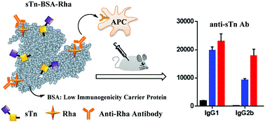 为了克服这些载体蛋白的问题,并提高TACA的免疫反应,本研究开发了基于内源性抗体靶向抗原呈递细胞APC的疫苗构建策略。根据人体内天然存在抗鼠李糖(Rhamnose, Rha)抗体,本研究设计并合成了具有鼠李糖Rha半抗原修饰的载体蛋白BSA-Rha,并与肿瘤相关糖抗原sTn进行偶联,制备了一系列sTn-BSA-Rha候选疫苗。通过小鼠免疫实验发现,在预免疫且含有鼠李糖抗体的小鼠中,sTn-BSA-Rha疫苗能激起更高的抗体滴度,说明鼠李糖抗体介导的靶向APC策略能够有效增强TACA疫苗的免疫反应。实验结果进一步显示,在没有鼠李糖抗体的存在下,Rha修饰的BSA蛋白也能一定程度上增强sTn的免疫反应,表明该类新型疫苗具有一定的自佐剂效应。另外,鼠李糖负载量越高,疫苗的抗体滴度越高,说明鼠李糖对疫苗的效果具有重要影响。该研究证明基于内源性抗体靶向APC的疫苗构建策略能够有效地提高TACA疫苗的免疫反应,并为进一步研究新型疫苗载体蛋白及其在肿瘤主动免疫治疗中的应用提供了新的思路。