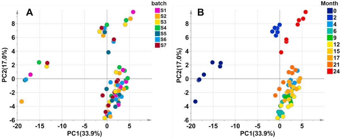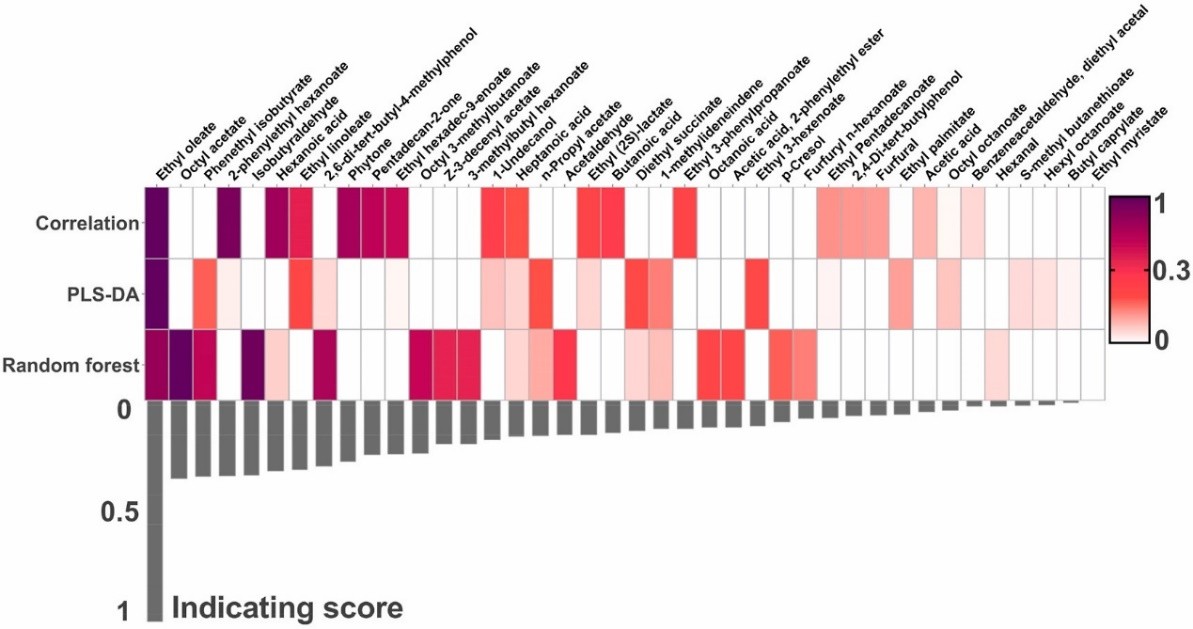 许正宏教授团队以泸型酒为案例,利用顶空固相微萃取-气相色谱/质谱联用的方法追踪了基酒在2年陈放过程中挥发性成分的动态变化规律,通过多种数学分析方法,得到系列标志储存时间的化合物,使不同储藏时间基酒的区分度得到提高。本研究归纳的白酒挥发性成分的变化规律对白酒年份酒鉴定模型的建立提供了重要信息,发现的标志性化合物也为建立可推广的鉴定方法提供了有力抓手。