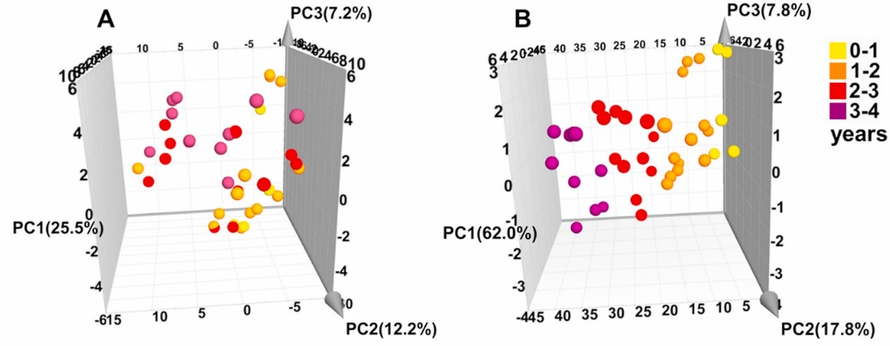 图4.通过主成分分析对不同年份瓶装白酒的进行区分,发现利用长链脂肪酸乙酯类化合物的数据集(B)较全部比全挥发性成分数据集(A),对不同储藏时间的白酒的区分度显著提高